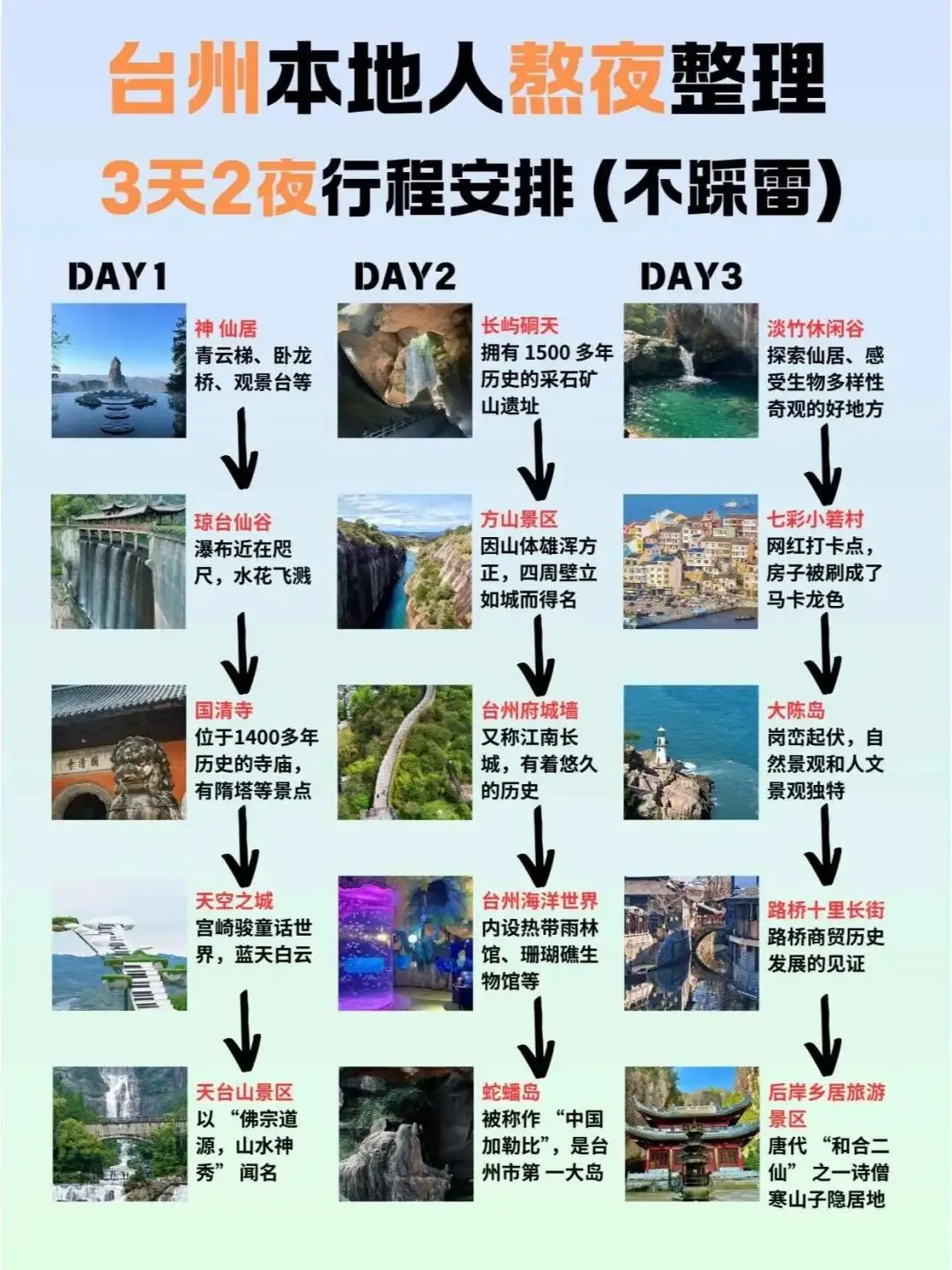 D1:台州府城墙(江南长城) →. 紫阳.古街(吃海苔饼、麦虾)→. 东湖公园