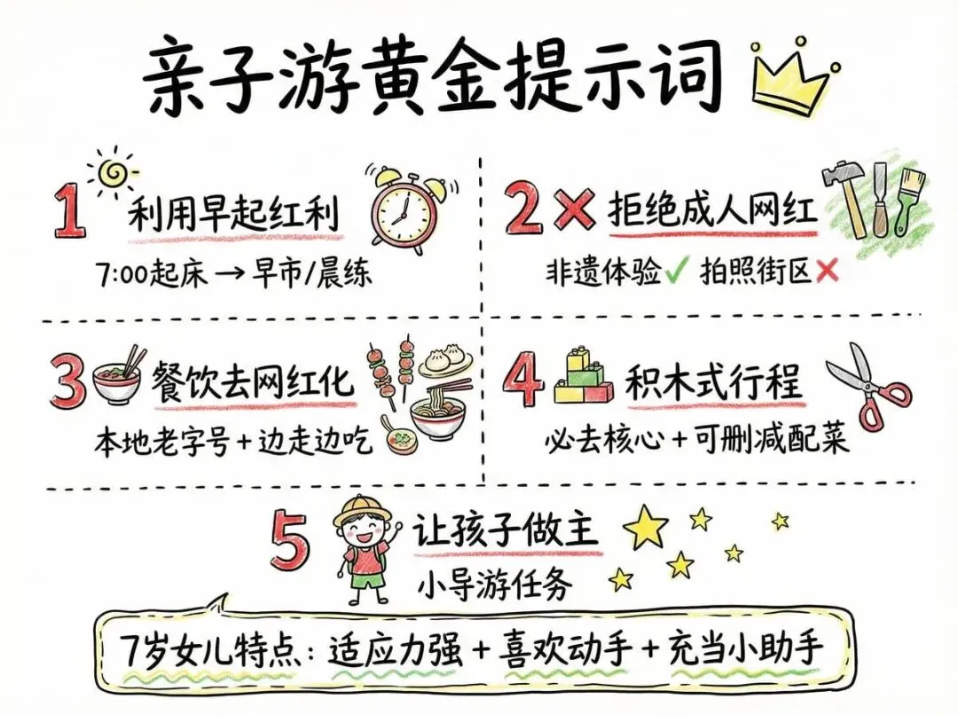 “你好,我要带7岁的女儿去 [目的地] 旅游,请基于我女儿‘适应力强、起得早、喜欢动手参与、甚至能充当小助手’的特点,为我们设计行程。请严格遵守以下 5 条原则: