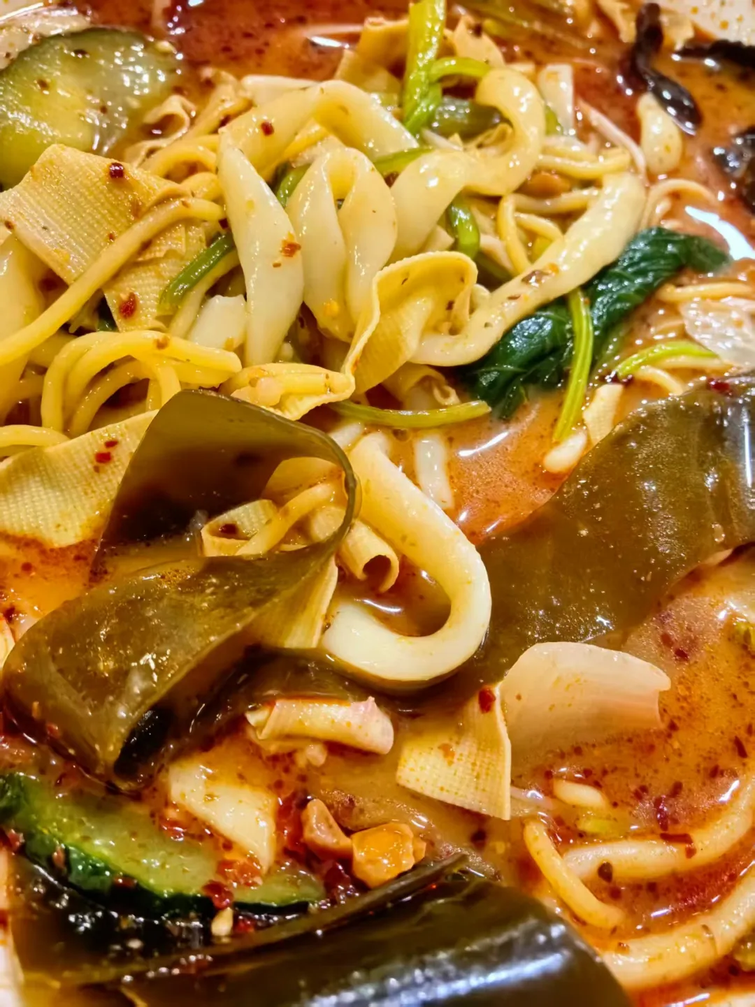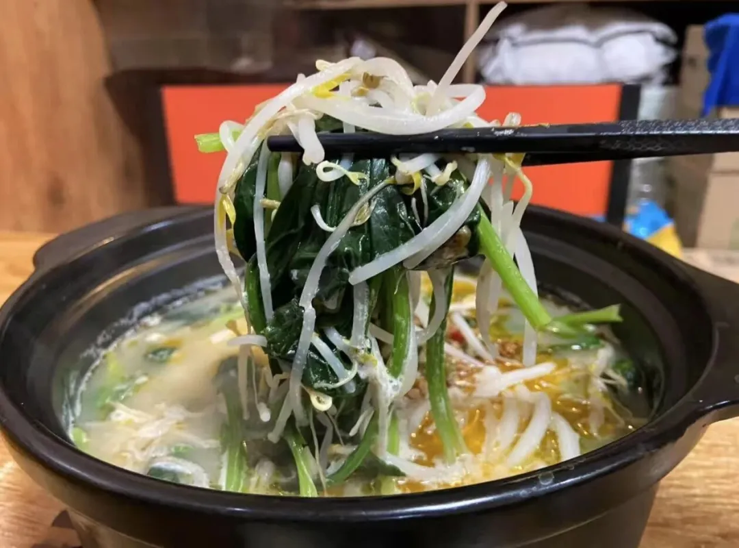 黑龙江人也有自己的“过桥米线”,端上桌就能吃,咕嘟咕嘟的汤还在翻滚,豆芽、海带、干豆腐丝、小油菜,再来几个丸子,表面飘着一层红油,入口鲜香。最灵魂的,是临吃前那几滴麻油,瞬间激发底料香气,米线裹着汤料的热气一股脑塞进嘴里,那种满足感,直叫全身都暖得舒坦!