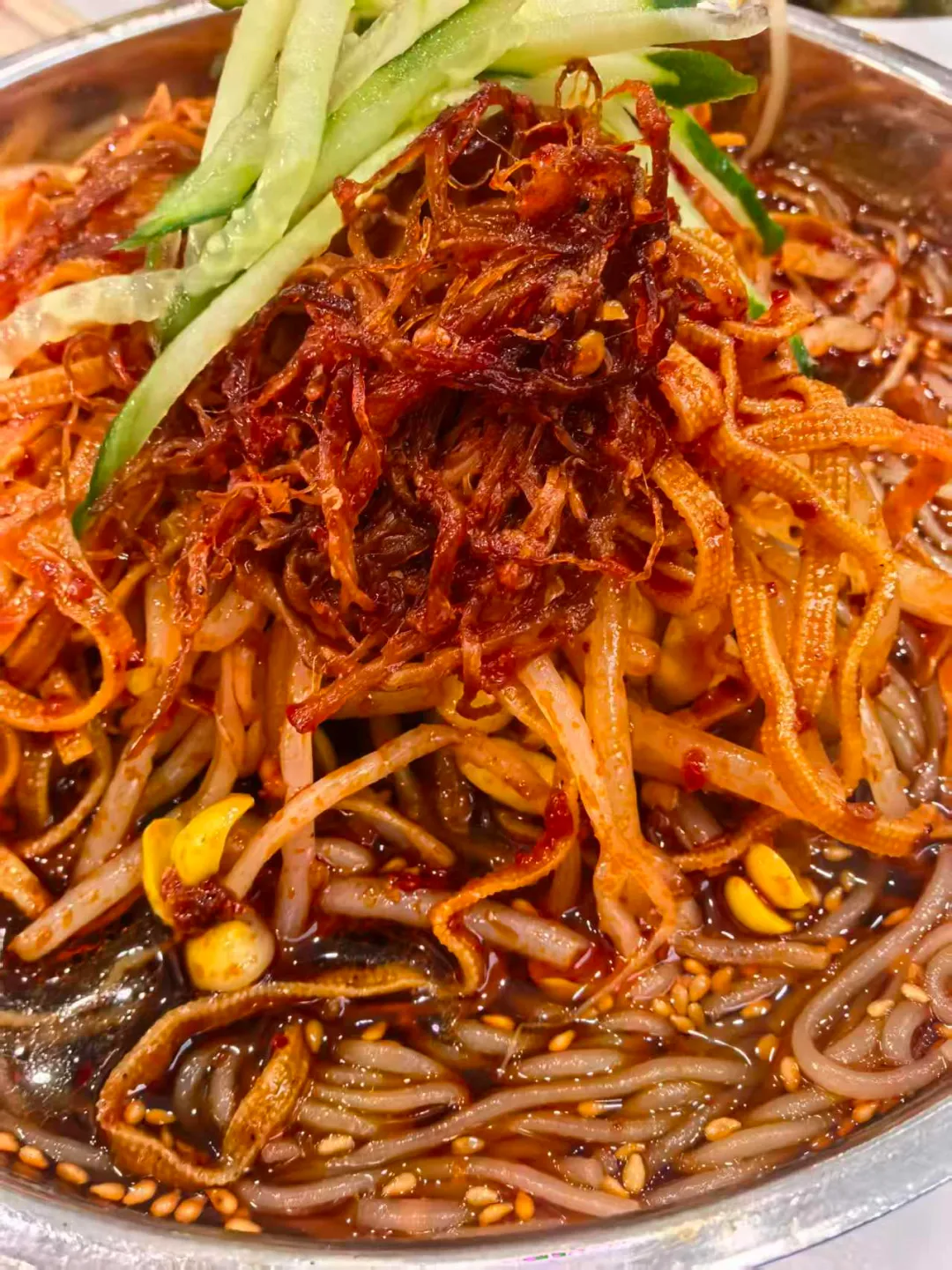 现压的荞麦面过凉水,浇上秘制酸甜酱,铺满牛肉丝、干豆腐丝、黄瓜丝、豆芽。冰爽与辛辣在口腔里同时炸开,反差感十足,一碗拌面,吃出了佳木斯人的豪爽。