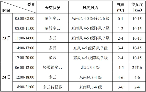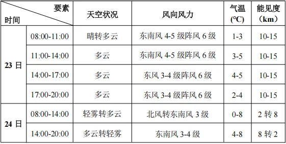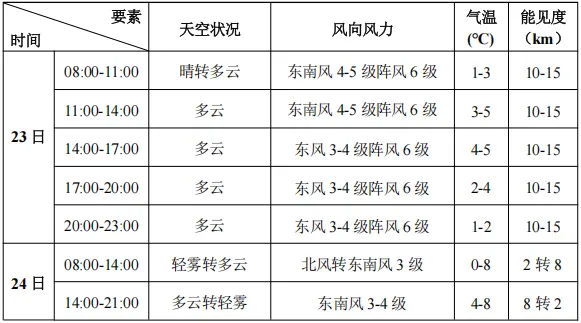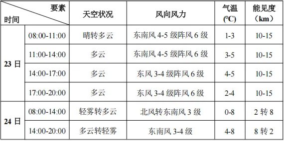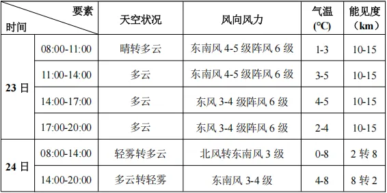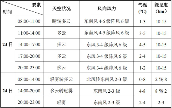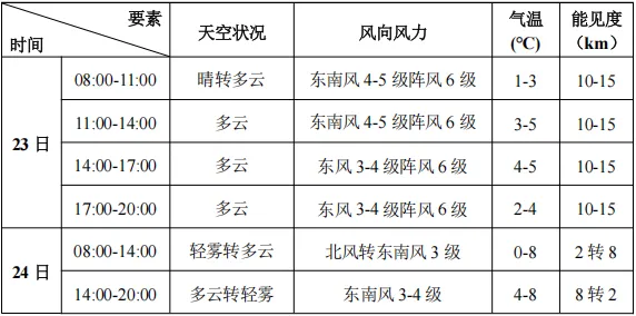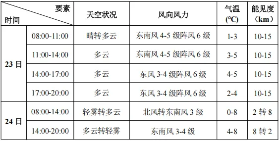 预计2月23-24日滨海新区旅游景点以多云天气为主。23日有东南风4-5级阵风6-7级。24日上午及傍晚有轻雾,最低能见度2km左右。