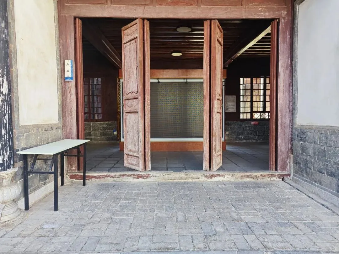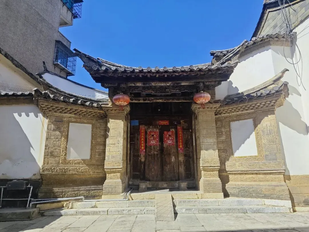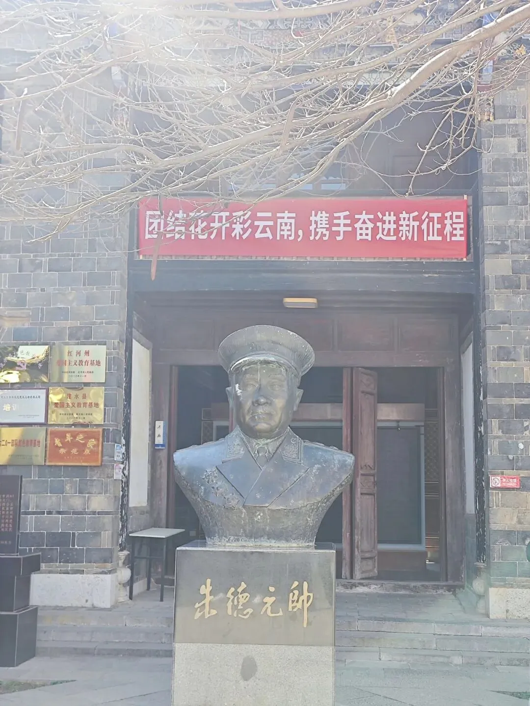 门口不大,就是普通民居一扇门的大小,大门旁是照壁,院子里有朱德元帅的铜像。看到了红河州文物保护单位的牌子,上面写着“黄美芝旧宅”。