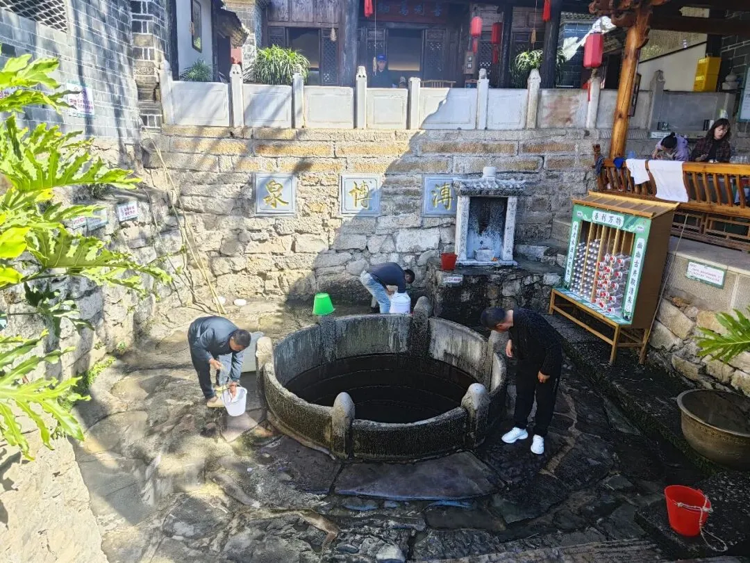 直面大板井,居然这么大一口井!直径近三米,旁边写着“溥博泉”。这口古井建于明洪武年间,至今仍在使用。有人正在打水,但看不懂他们的操作,打上来的井水倒进桶里,等桶里装满水再倒在地上,这是要洗自己的桶吗?后来又在桶口覆上一层布,再往里面加水,应该是为了过滤井水吧。