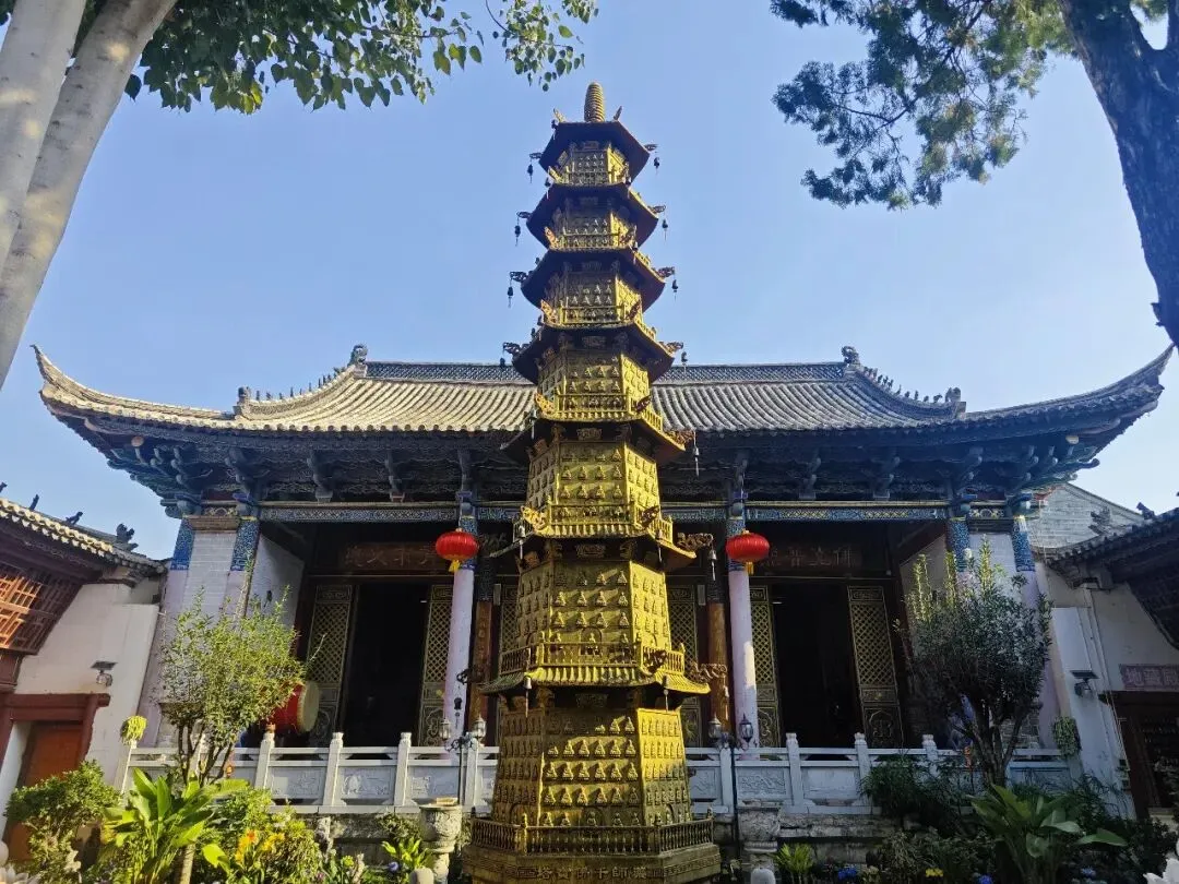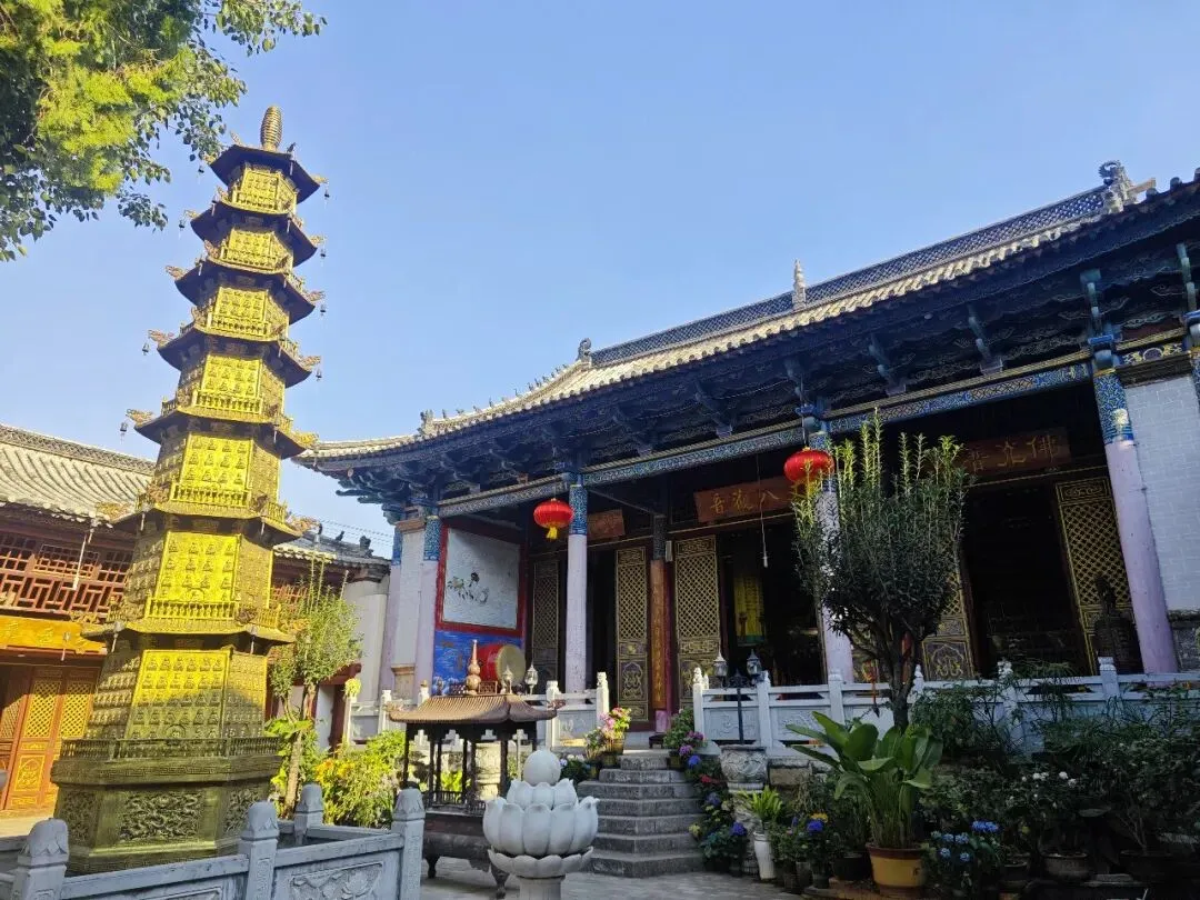 门口两座石狮子,入口便是天王殿,接着是大雄宝殿。从大雄宝殿旁边的小道往后走,后面有一座丈八观音殿,殿内传来一位僧人的念经声。最吸引眼球的是院子里金灿灿的宝塔,阳光照射下,金色的饱和度拉到最高。