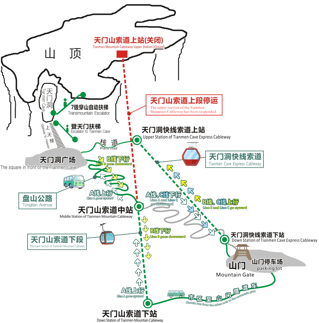 【游览线路】 景区开放【双程索道A线、B线、C线】游览线路,【单程索道1线、2线】游览线路继续暂停开放。【双程索道A线、B线】仍按天门山索道上半段(中站至山顶上站)停运期间调整后的运营路线,具体游览线路如下: 1 2 3 路线为:自「山门」检票进山——乘「天门洞快线索道」上行至天门洞游览——自天门洞口后方乘「7级穿山自动扶梯」上山顶——游览山顶各景点——再乘「7级穿山自动扶梯」返回天门洞——乘「天门洞快线索道」下山至山门出景区