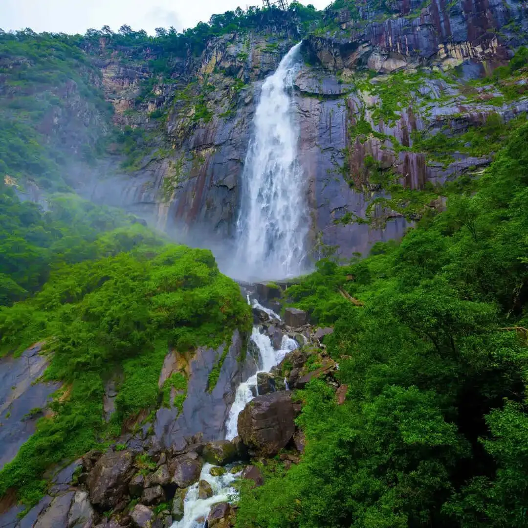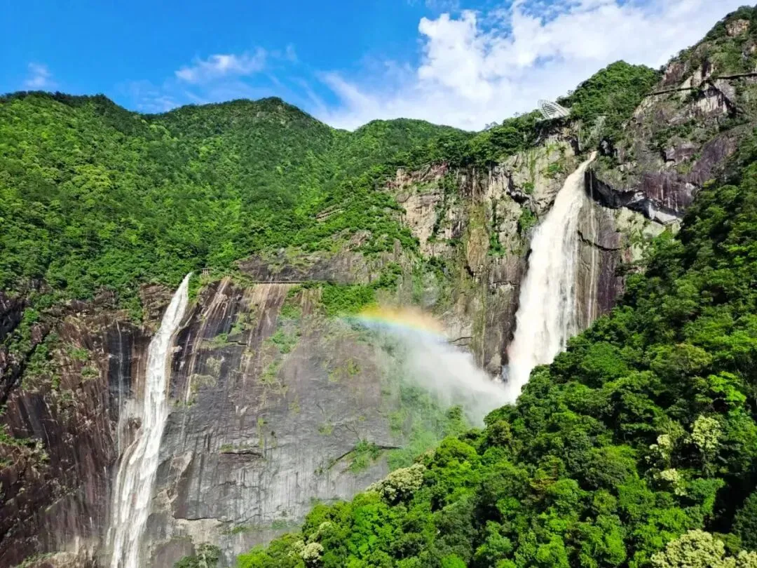 岱仙瀑布落差280.12米,水流如银河倾泻,声震山谷。溪水从峭壁奔腾而下,形成“华东第一瀑”的壮丽奇观。