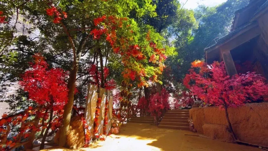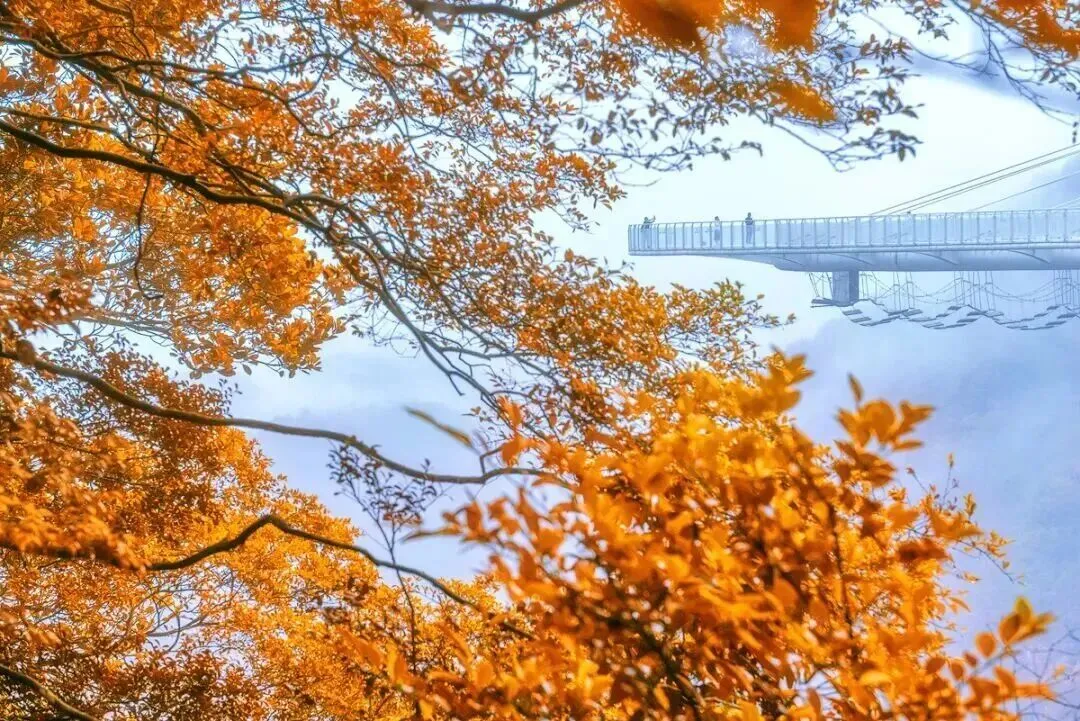通往岱仙瀑布的栈道上,红枫沿步道绵延,叶片如火焰般炽烈,与青翠山峦形成鲜明对比,脚踩犹如落叶织就的金色地毯,身处其中,仿佛跌进秋日的童话,随手一拍就是“莫奈花园”秋日同款大片。