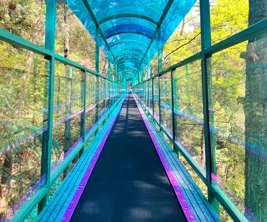拥有“世界垂直高差最大的单边玻璃悬廊”、“世界垂直高差最大的单边玻璃悬廊晃桥”两项世界纪录的天空之心玻璃观景台悬于瀑布上方,漫步云端之际,尽享惊心动魄的视觉盛宴。