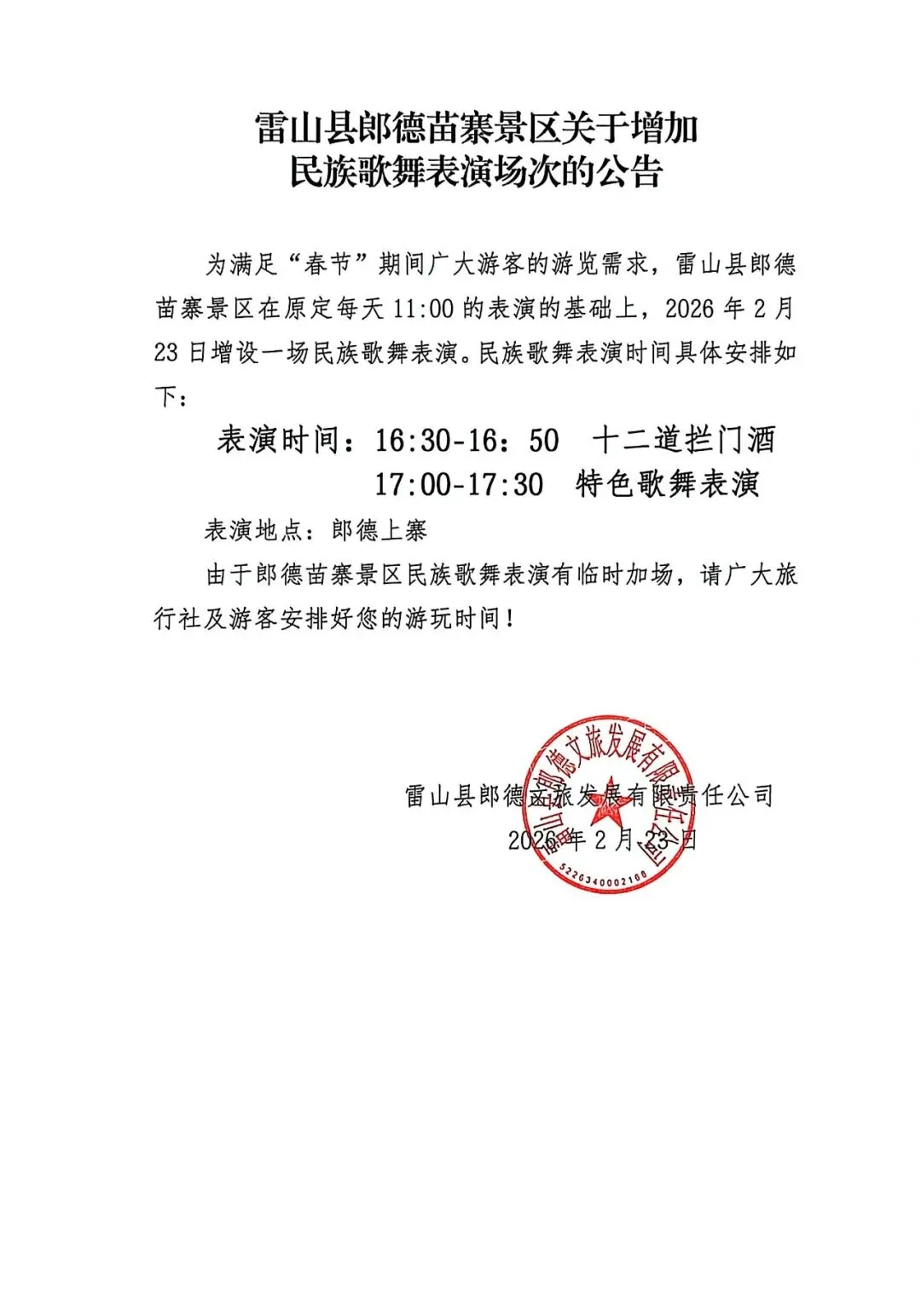 雷山县郎德苗寨景区关于增加民族歌舞表演场次的公告