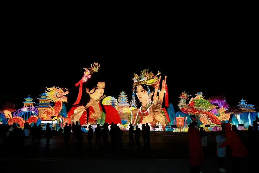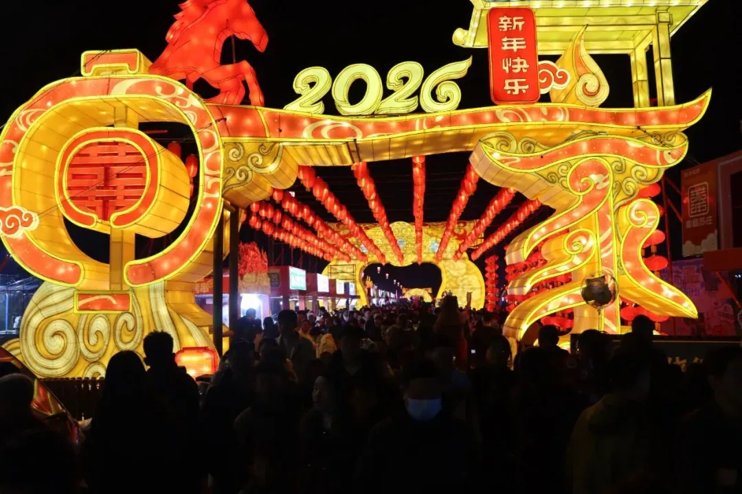 夜幕降临,喜镇苏庄的花灯依次点亮,整个景区被装点得流光溢彩。“锦龙衔花”“乘龙快婿”“喜神送财”“骏马来临”等大型主题灯组造型别致、灯火璀璨,吸引众多游客驻足观赏、拍照打卡。