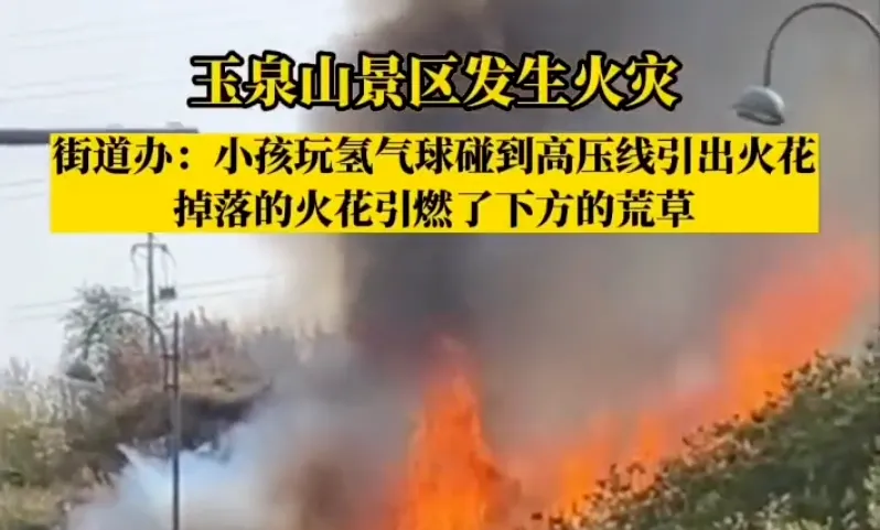 2023年4月16日,山西太原玉泉山景区一名小孩游玩时,氢气球不慎从手中脱落,飘向高压线,瞬间引出火花,掉落的火花引燃了下方荒草。