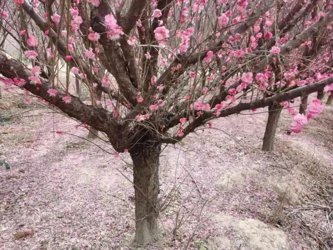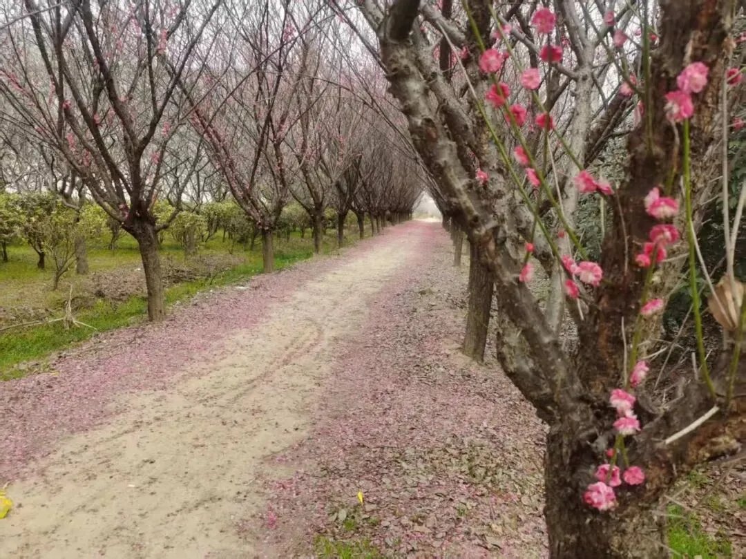 在这条路的东南方向不远处,还有一处梅林,更值得移步一赏。身处其间,孤寂也显得是那般华丽。其实,梅花应该是属于冬天的,比如说“岁寒三友”,比如“四君子”,其中都有梅,它是在寒冬腊月减霜裁冰,傲然绽放的一种花,它有傲视霜雪的风骨,品质高洁,与梅为友,而又何来的孤寂?望着一地的落红,记起陆游“零落成泥碾作尘,只有香如故”的句子,悄然对梅花多了一分敬意。