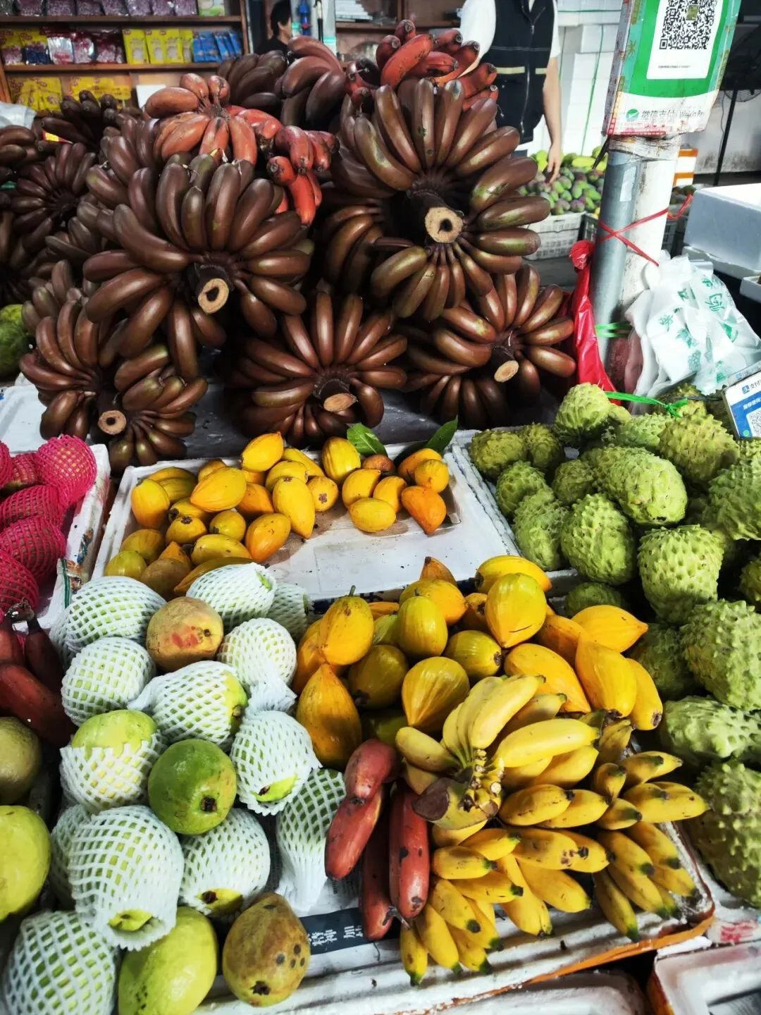 市场里各种热带水果,最多的是芒果、菠萝、紫皮香蕉、莲雾。我们分别买了点莲雾、释迦、芒果、菠萝。