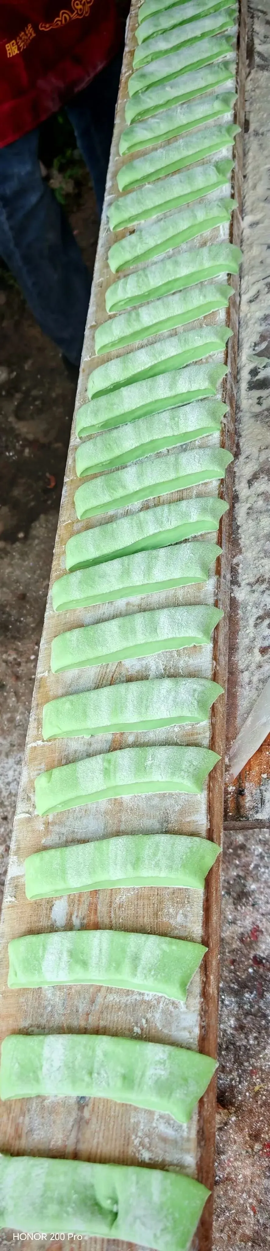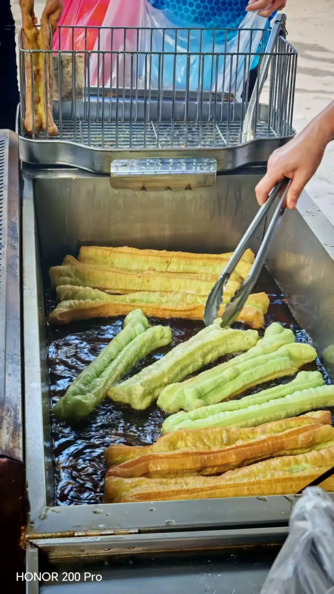市场的一个角落里一个炸油条的摊排着长龙在等油条,是斑斓汁和的面炸的油条,看着挺不错,我们也买了3条带回给孩子们,因为还买有别的,想着油条分着吃,谁知道先吃的三个每人一根油条就干完了,其他人也没尝到。