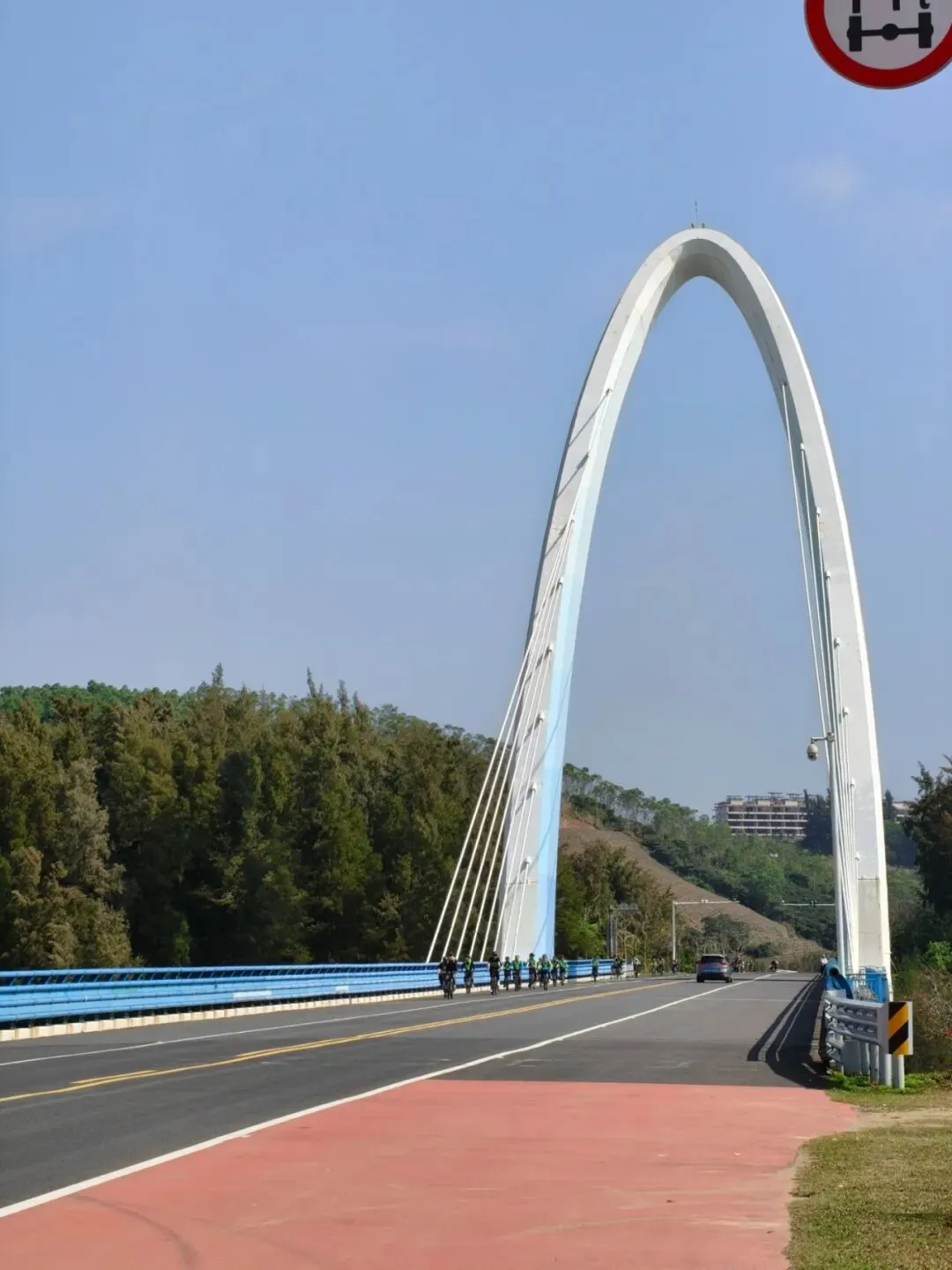拍完牌子转头回来刚好看到一个挺多人的骑行队伍从前方的桥上骑来。在这个旅游公路上能够看到很多这样的骑行者,男的、女的,甚至还看到一个几岁的小朋友在爸爸的陪同下也在路上骑。真是又佩服又羡慕他们!