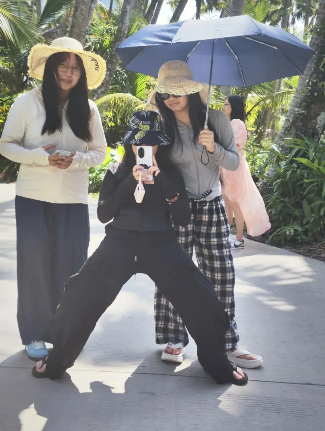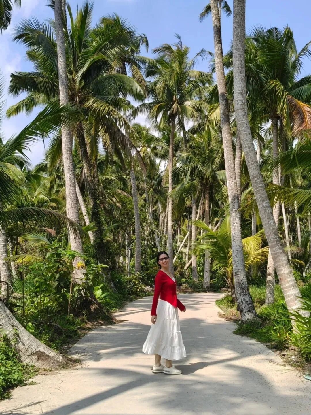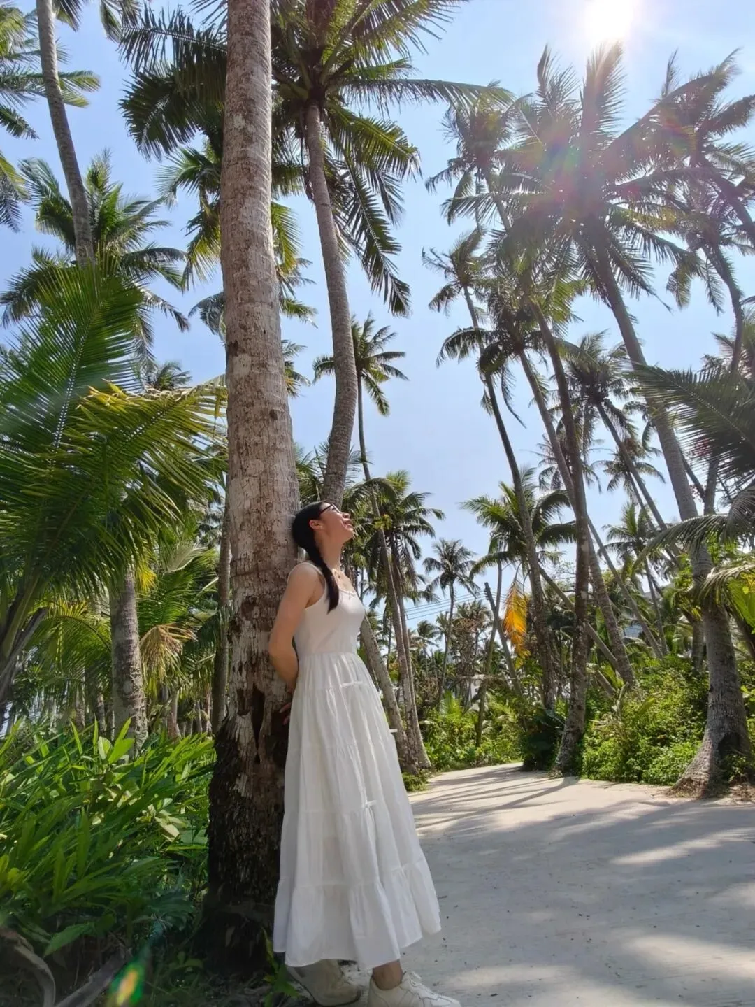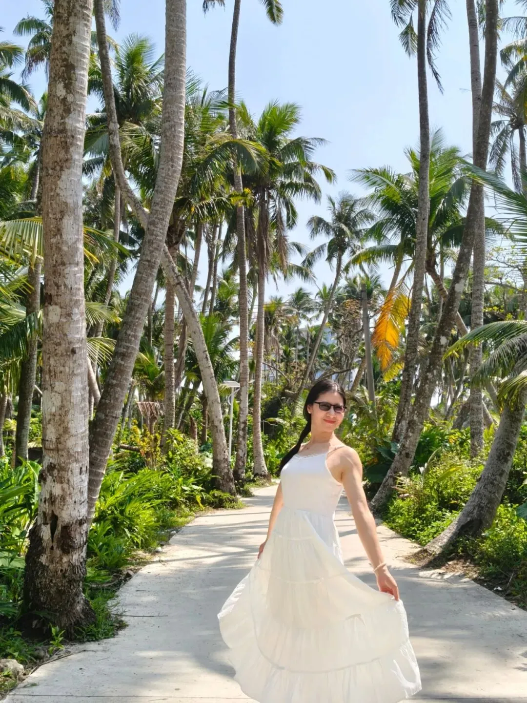 然而,下车走了一会发现天太热了,太阳好晒,跟大夏天一样,过中午了姐姐们可能也有点饿了,再走下去一个个就要焉了,又决定算了,就近走进一条横向的小路里去拍点照片就算了。纵然没有景区里的最美椰林漂亮,不过应该也差不太多了吧!😂