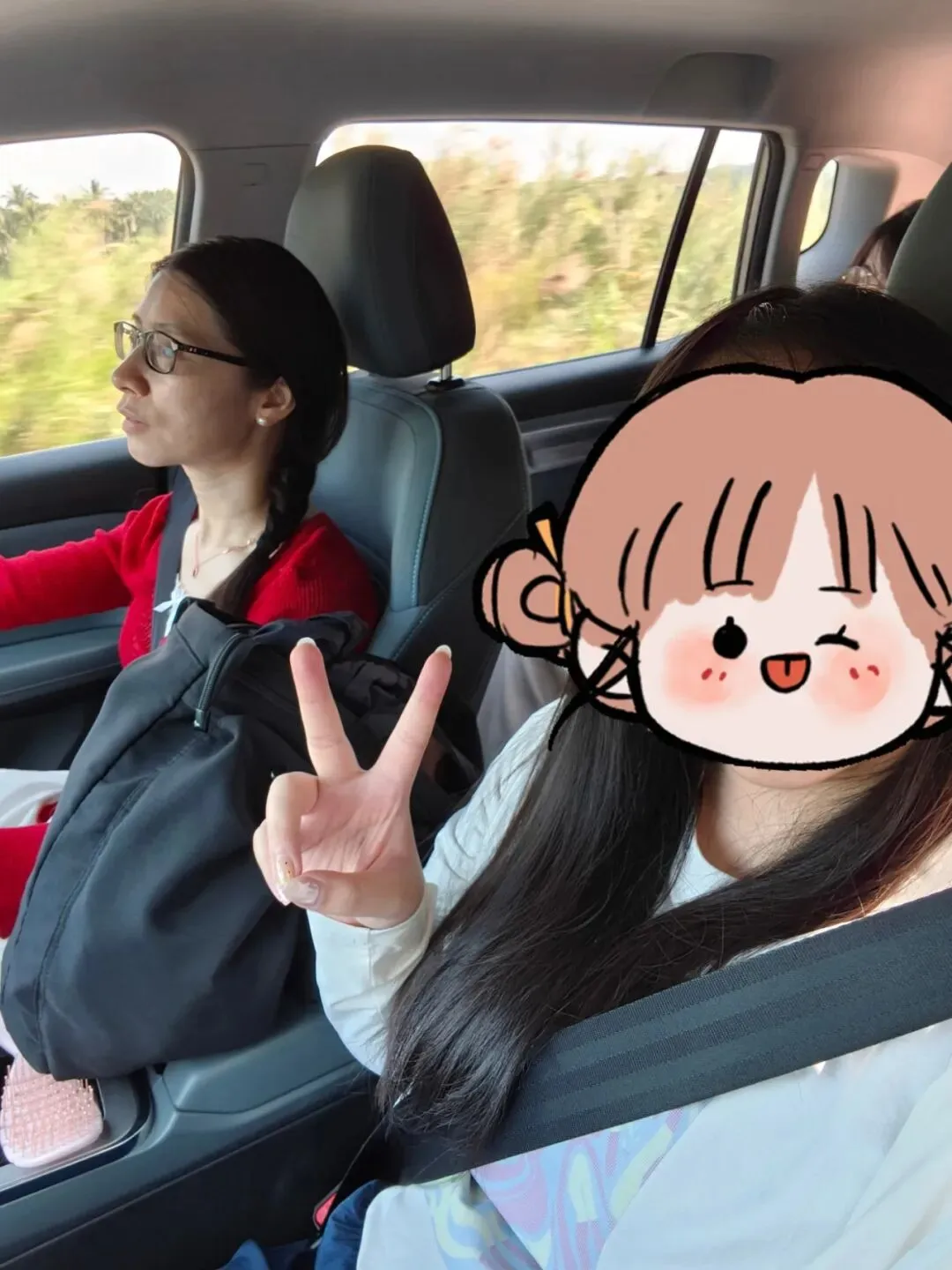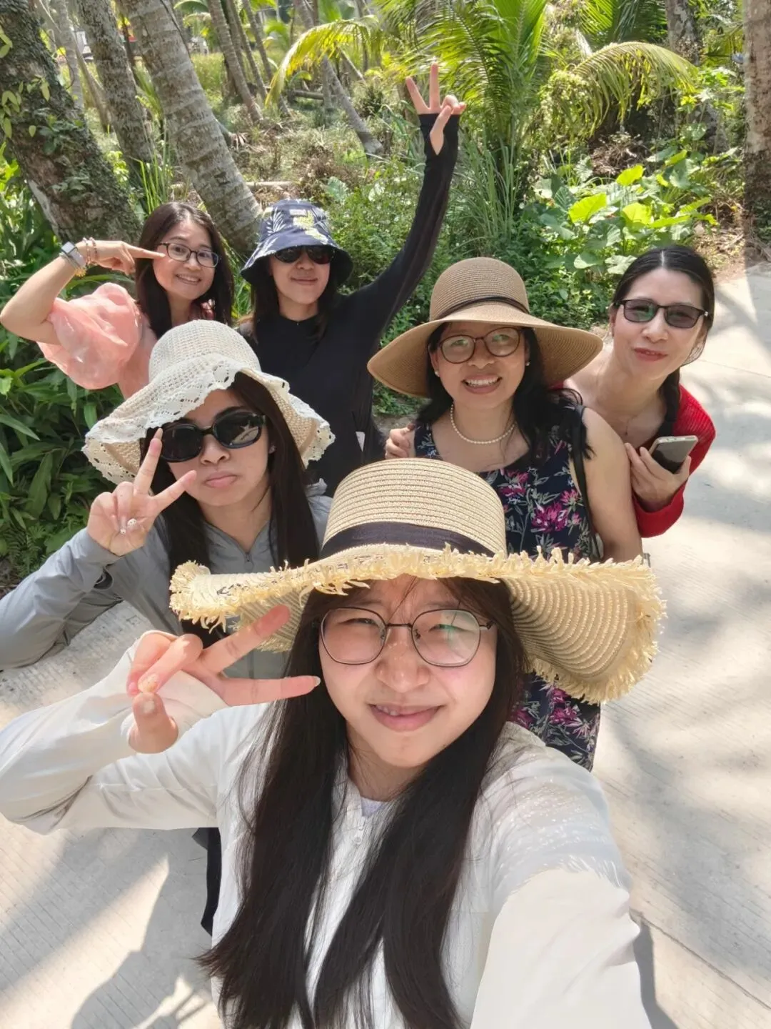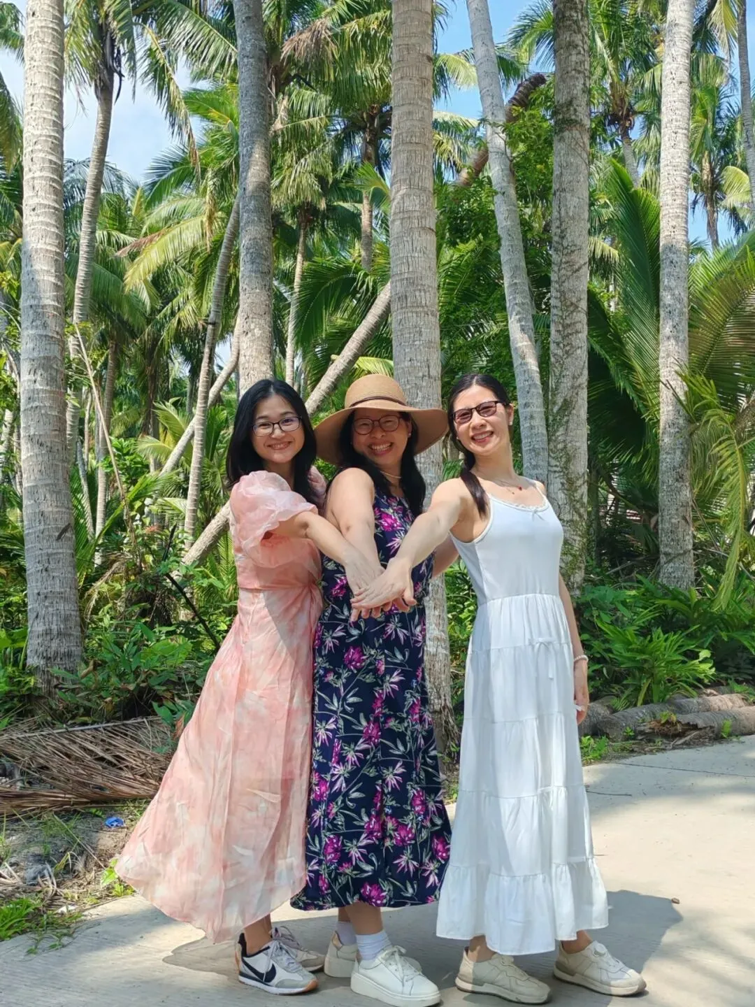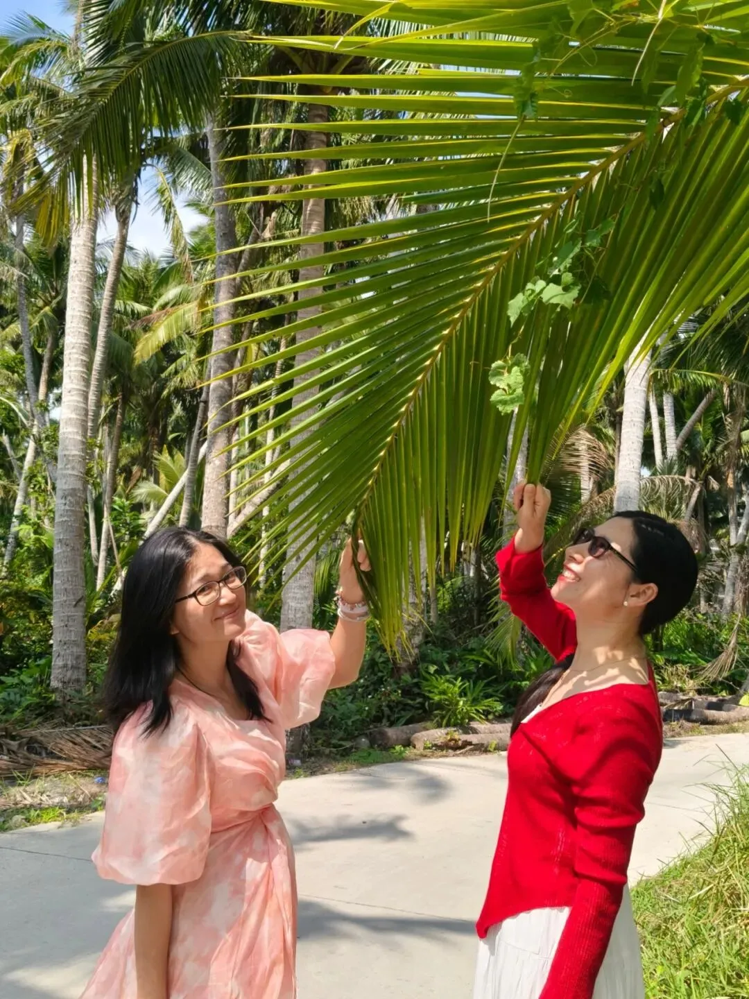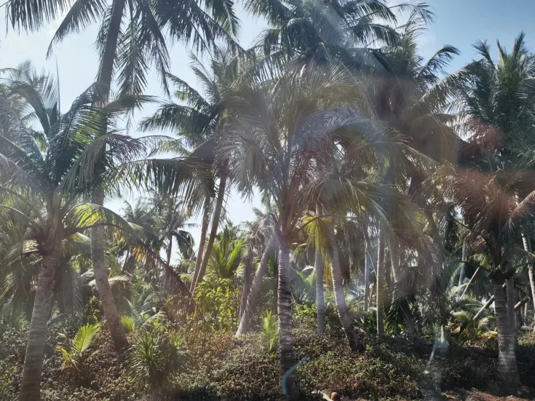 然而,下车走了一会发现天太热了,太阳好晒,跟大夏天一样,过中午了姐姐们可能也有点饿了,再走下去一个个就要焉了,又决定算了,就近走进一条横向的小路里去拍点照片就算了。纵然没有景区里的最美椰林漂亮,不过应该也差不太多了吧!😂
