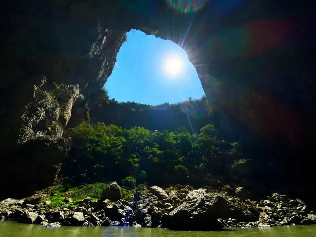 因洞顶的光线照射到波光粼粼的水面,再反射到周围的岩壁,使岩壁金光闪闪,形成奇特的景象,所以称之为金光天。这独特的场景,特别是乘船穿过这里时,沐浴着阳光,看着崖壁上的道道金光,这般梦幻的场景,不拿出手机发个朋友圈简直可惜了