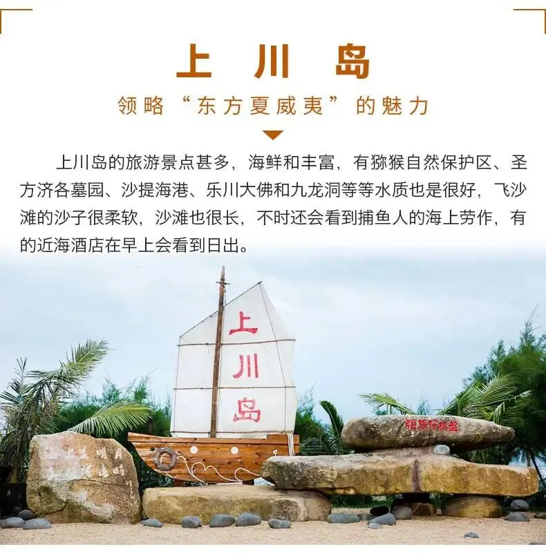 【门票说明】台山上川岛套票成人票1张,与景区自行购买相同待遇。上岛当天有效,返程7天内有效,沙滩门票7天有效(必须保留好纸质票或者短信二维码)