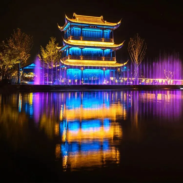 在春秋阁外赏梦幻的光影水幕秀!