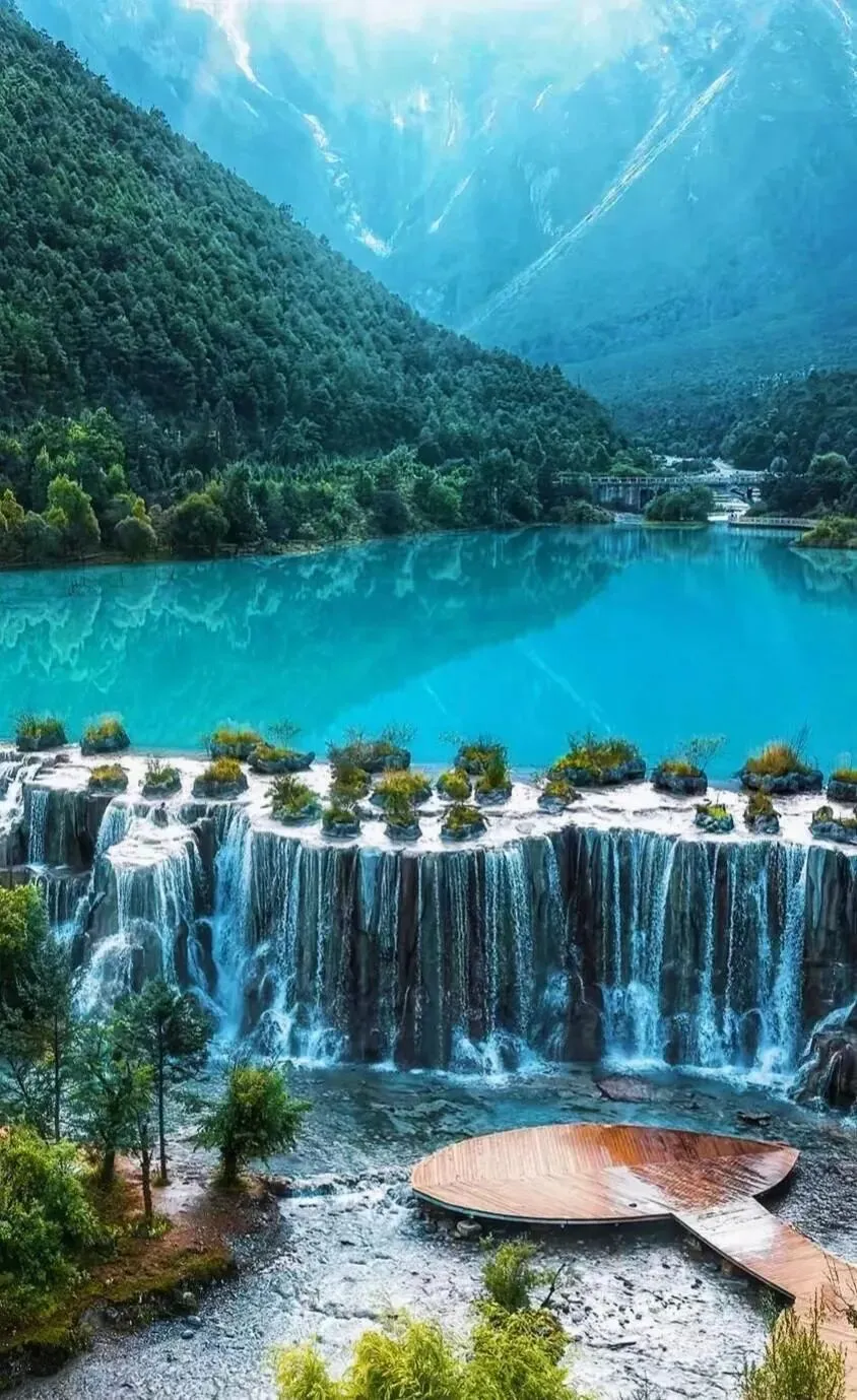 5.蓝月谷:蓝月谷风景区是位于云南省丽江市玉龙县玉龙雪山东麓的景区,景点有玉液湖、镜潭湖、蓝月湖和听涛湖。蓝月谷是丽江玉龙雪山冰川的万古冰雪消融之后顺着峭壁流淌而下,不断汇集为山涧、溪流,最终在上游深谷之中形成了清澈见底、甘冽无比的河流。玉龙雪山管委会于2006年投资开发了蓝月谷景点,建设6个景观拦砂坝。