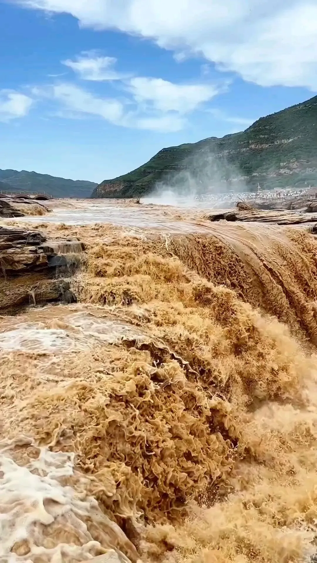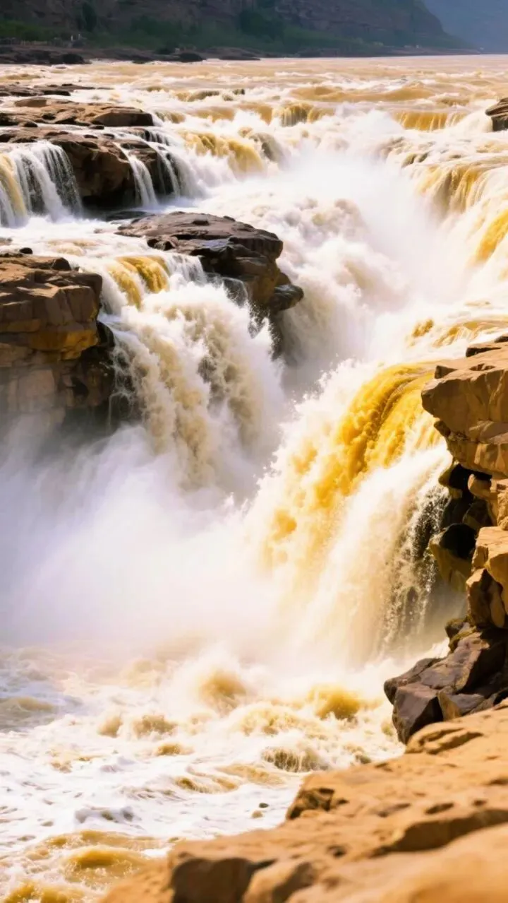 7.黄河壶口瀑布:壶口瀑布是黄河干流瀑布。东濒山西省临汾市吉县壶口镇,西临陕西省延安市宜川县壶口镇,为两省共有旅游景区。南距陕西省西安市350千米;北距山西省太原市387千米。壶口瀑布是中国第二大瀑布,世界上最大的黄色瀑布。黄河奔流至此,两岸石壁峭立,河口收束狭如壶口,故名壶口瀑布。瀑布上游黄河水面宽300米,在不到500米长距离内,被压缩到20—30米的宽度。1000立方米/秒的河水,从20多米高的陡崖上倾注而泻,形成“千里黄河一壶收”的气概。