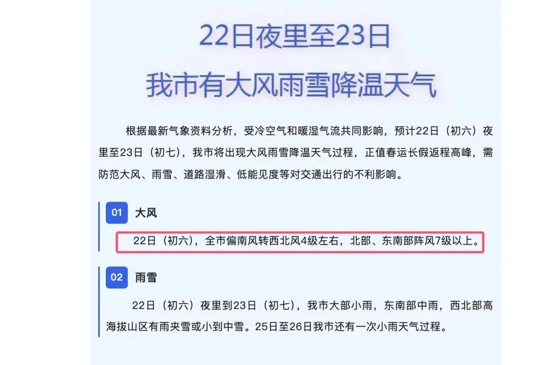 另据南阳市气象部门22日白天发布的天气信息,受冷空气和暖湿气流共同影响,预计22日(初六)夜里至23日(初七),该市将出现大风雨雪降温天气过程。22日(初六),全市偏南风转西北风4级左右,北部、东南部阵风7级以上。