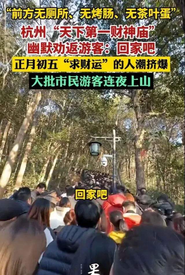 2026 年马年春节的景区,热闹得不像话,却也离谱得好笑。正月初五迎财神,杭州北高峰的灵顺寺被游客挤得水泄不通,大批人连夜上山,只为烧一炷香求个好彩头,结果愣是被景区工作人员的大喇叭劝退:“前方无厕所、无烤肠、无茶叶蛋,登山道限流要等 4 到 5 个小时,各位旅客,回家吧!”