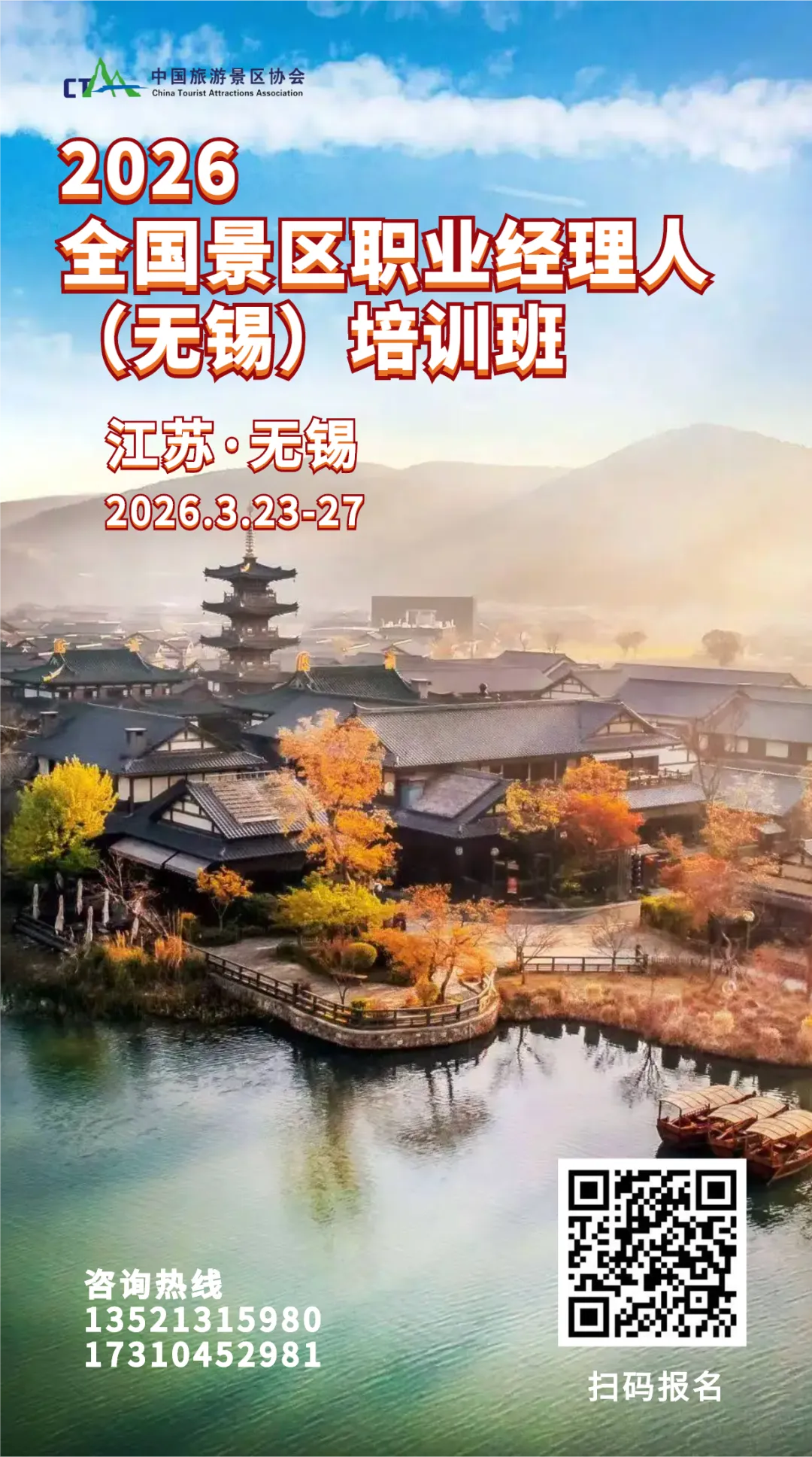 为加快推进我国旅游景区职业化队伍建设,培养适应景区发展需要的高素质管理人才,“2026年全国景区职业经理人资质(无锡)培训班”定于2026年3月23日至27日在江苏省无锡市举办。培训共计四天三晚,并游学拈花湾、鼋头渚、南长街历史文化街区等景区。