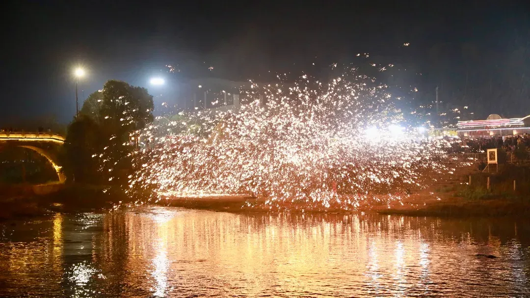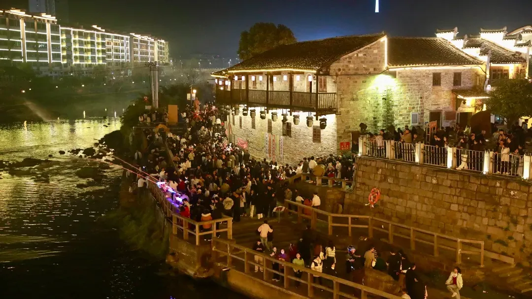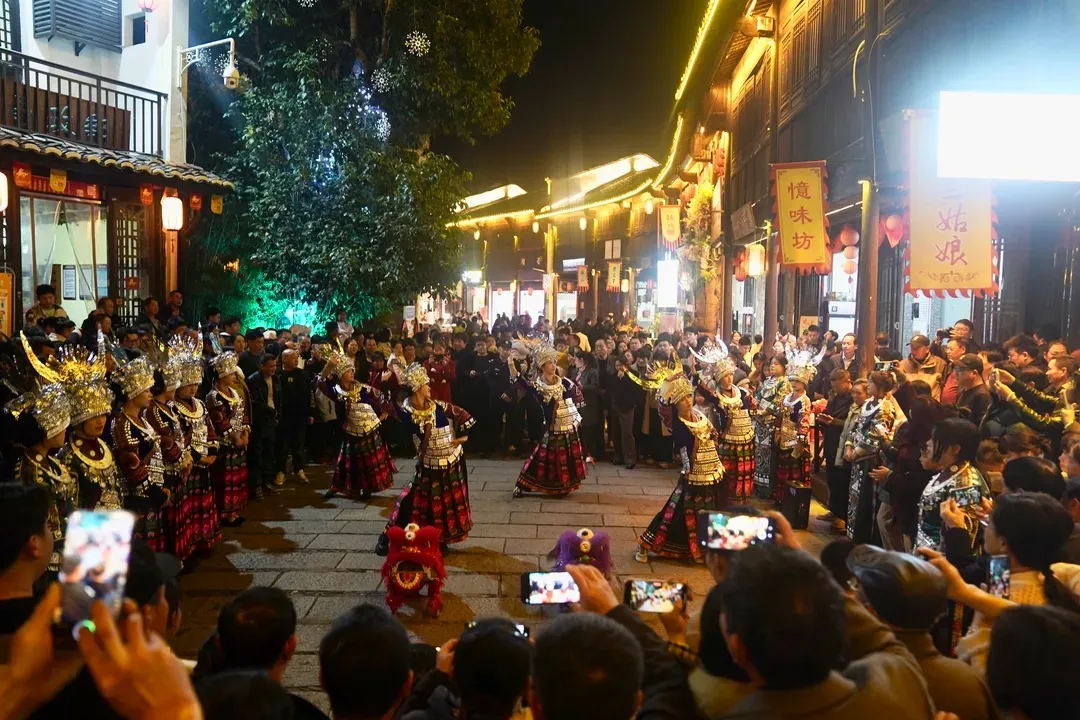20:15,横港桥亲水平台的打铁花表演如期登场,将气氛推向高潮。滚烫的铁水被奋力击向夜空,仿若漫天星雨,与古城交相辉映,市民游客纷纷拿出手机记录这一震撼瞬间,不时发出阵阵赞叹。与此同时,民族风情歌舞展演、“登科郎君”NPC互动等特色环节同步开展,在丰富市民游客夜游体验的同时,让新春的欢乐氛围不断延续。