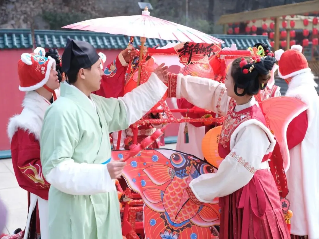 五莲山景区以卖货郎NPC为媒介,复刻古早市集的烟火气息与交易场景,让游客在角色交互中完成时空穿越的情感体验。红叶柿岩则以“鳌鱼巡游”为视觉锚点,千盏花灯点亮古村肌理,实现光影叙事与在地文化的有机融合。灵岩胜境在成功打造“灵岩小书生”IP的基础上,推出“灵岩卖货郎”全新NPC形象,他穿行于古寺廊道与山间石阶之间,以市井烟火气唤醒游客对传统年节的集体记忆。马踏湖推出渔家女、渔家翁等水乡烟火里的特色NPC,再现原生态鱼鹰捕鱼场景,共同构成一幅流动的水乡生活图景。