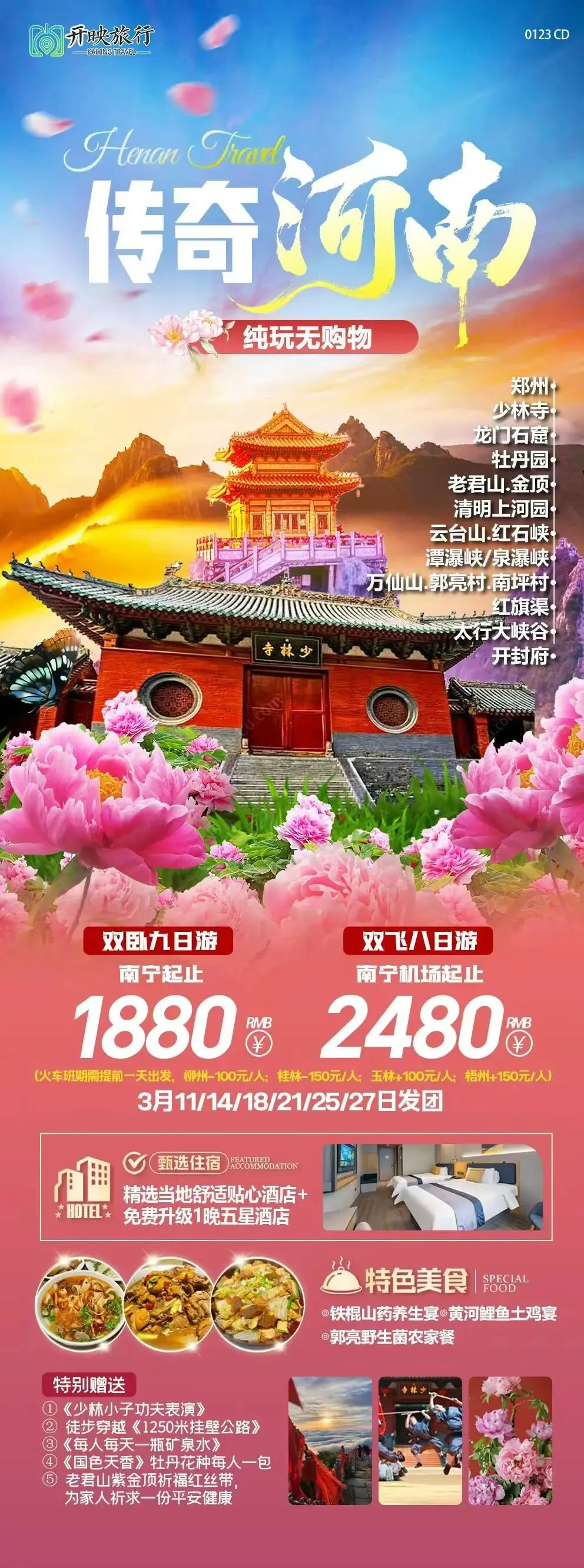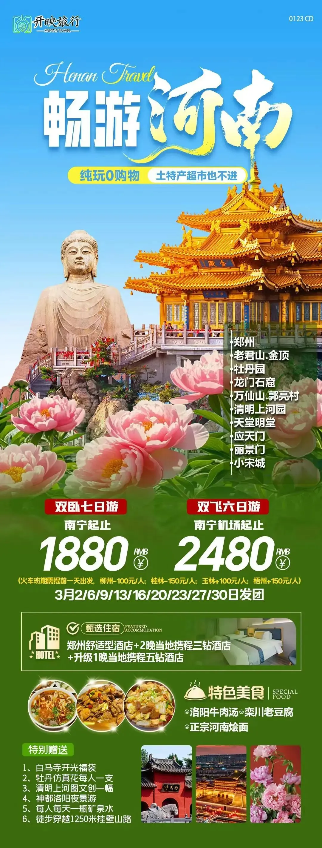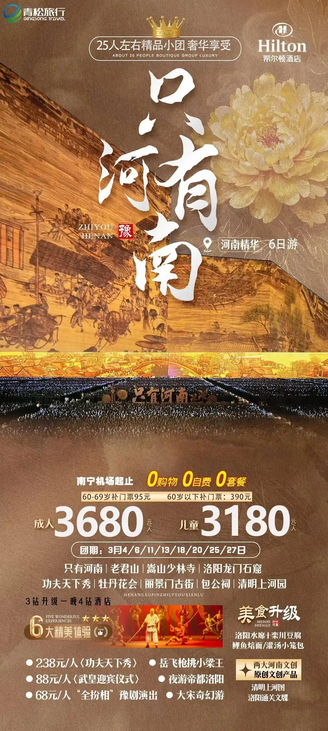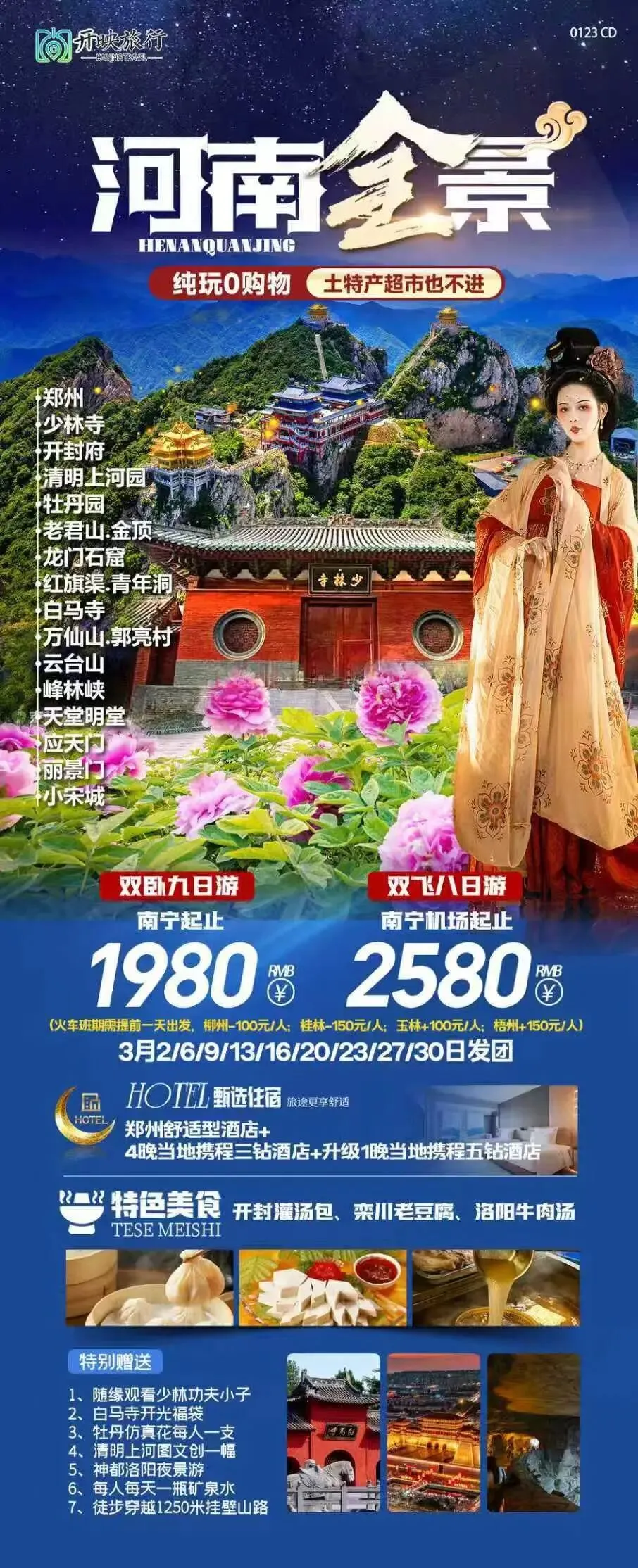 河南:3月旅游线路汇总(景点:少林寺、清明上河园 、龙门石窟、应天门、洛邑古城、郭亮村、挂壁公路、云台山、老君山、曹魏古城.)