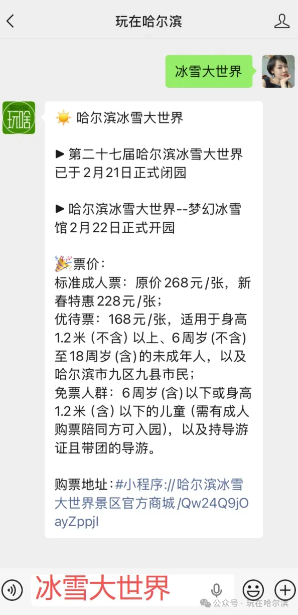 在微信对话框回复【冰雪大世界】获取购票地址及景区相关信息