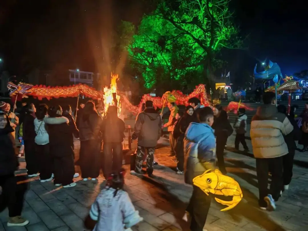 当夜幕降临,依山傍水的蒋沙渔村展现出最热烈的一面。大红灯笼高高挂起,夜色中的“一夜鱼龙舞”精彩上演,彩龙翻腾,鱼灯穿梭,光影闪烁间仿佛诉说着渔村的丰收与希望。表演现场大家举着手机记录精彩瞬间,欢呼声此起彼伏。紧接着,烧宝塔活动火热开场,通红的火光映照着人们笑脸,大家围着宝塔祈福,在熊熊火焰中祈愿新的一年红红火火。