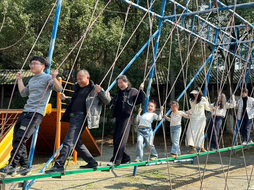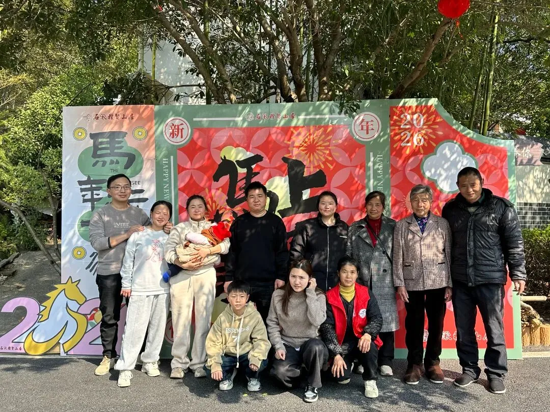 走进石湫礼贤山居,仿佛步入一幅灵动的山水画卷。景区内的“新年”打卡点前,一家老小对着镜头笑得灿烂,在青山绿水的映衬下定格团圆的温馨瞬间。旁边的传统农具展示区也吸引了不少游客,大家一边端详着老物件,一边聊起儿时的农耕记忆,在欢声笑语中感受岁月的温度。