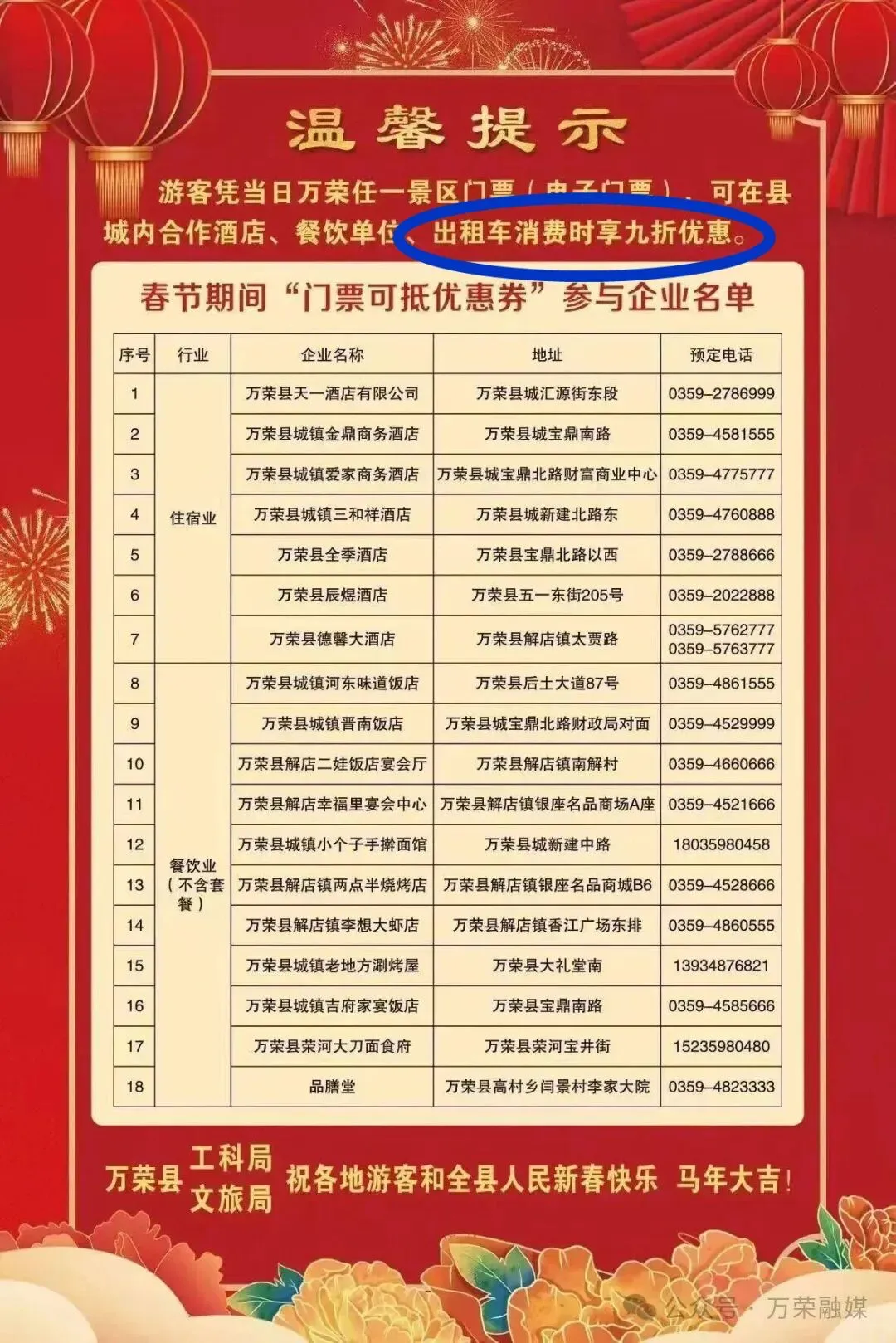 在节前的活动介绍是这样来的描述的:“游客凭当日万荣任一景区门票(电子门票),可在县城合作酒店、餐饮单位、出租车消费时享九折优惠。”
