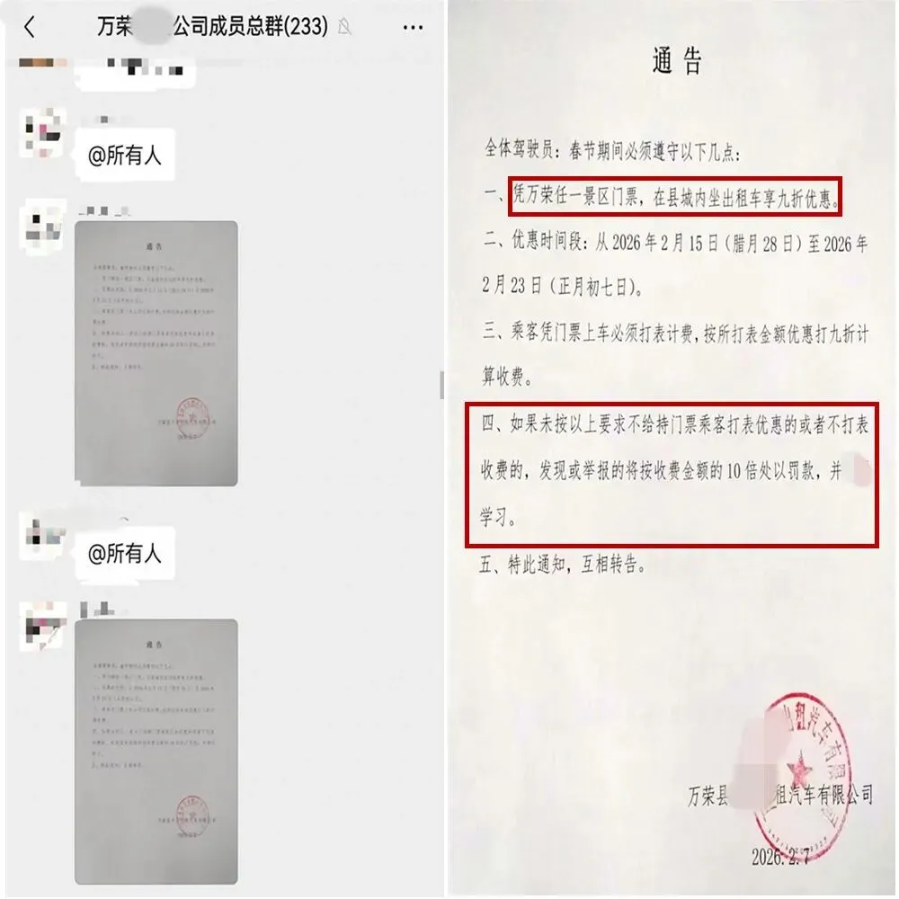 在相关出租车公司在工作群里发出的《通知》来看,这一项“打车优惠”活动,从2026年2月15日一直持续到2月23日,基本囊括了整个春节假期。