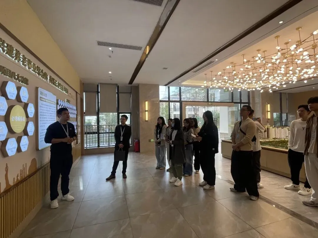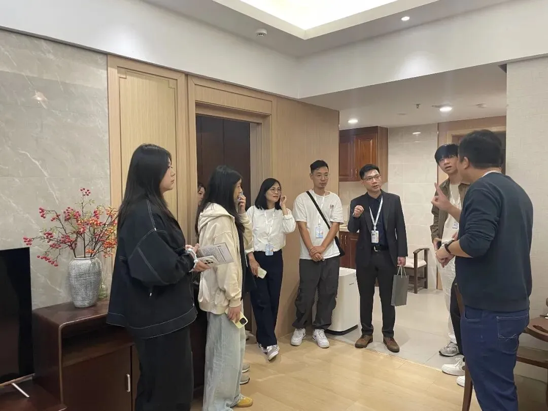 在導覽中,學生們對園區的全方位服務設計深感興趣:從琴棋書畫、歌舞課程到棋牌娛樂的文化設施,從酒店式探訪空間到兒童遊樂區的細緻安排,展現對長者及其家庭的深度關懷。面對學生提出的"醫療專業性與服務溫度平衡"、"智慧養老技術應用"等問題,園方以實務案例詳盡解說,激發學生對健康產業跨界融合的思考。