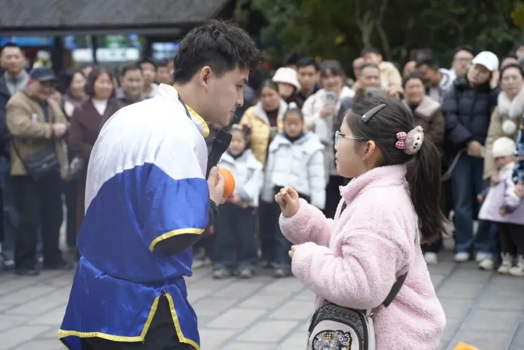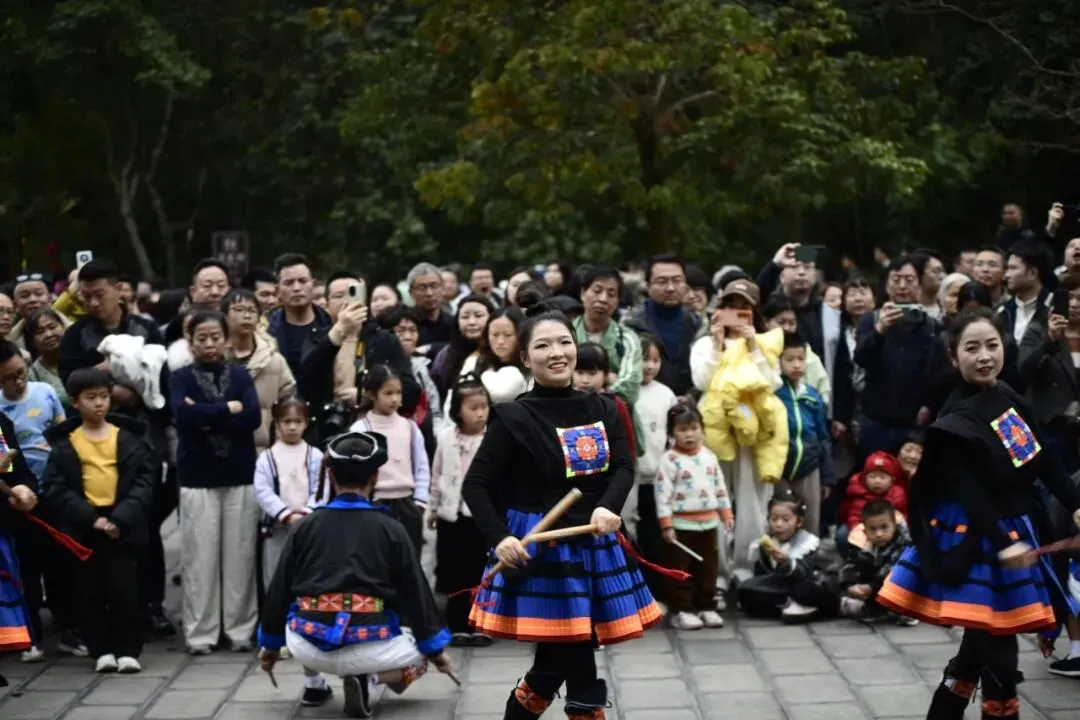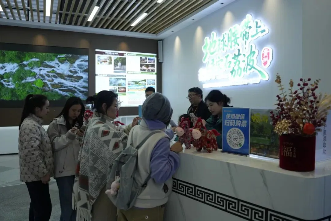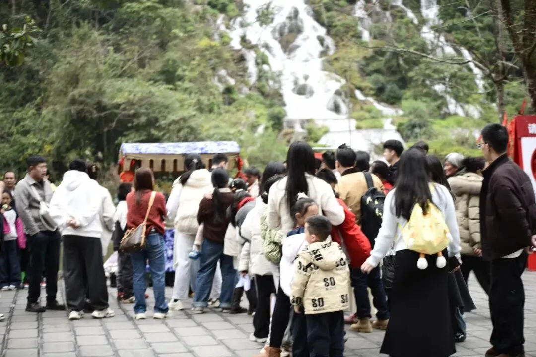 线下,景区全域张灯结彩、喜气洋洋,在东门集散中心、七孔古桥、翠谷瀑布、卧龙潭等核心景点,精心设置特色新春打卡点,一步一景皆有年味;正月初二至初五,特邀瑶族、苗族、水族等少数民族同胞开展巡游互动,非遗贺岁展演轮番上演,瑶山猴鼓舞气势磅礴、糖画技艺精妙绝伦,让游客近距离感受非遗文化的独特魅力;同步推出旅游护照集章活动,游客入园后寻找NPC打卡集章,即可领取马年专属纪念礼,翠谷瀑布旁的魔术表演更添趣味与惊喜,让每一位游客在赏山水、品文化、玩互动中,沉浸式体验民族风情与浓浓新春年味。