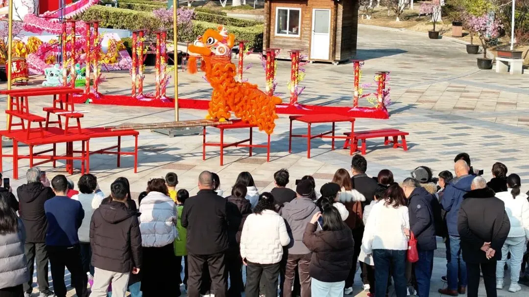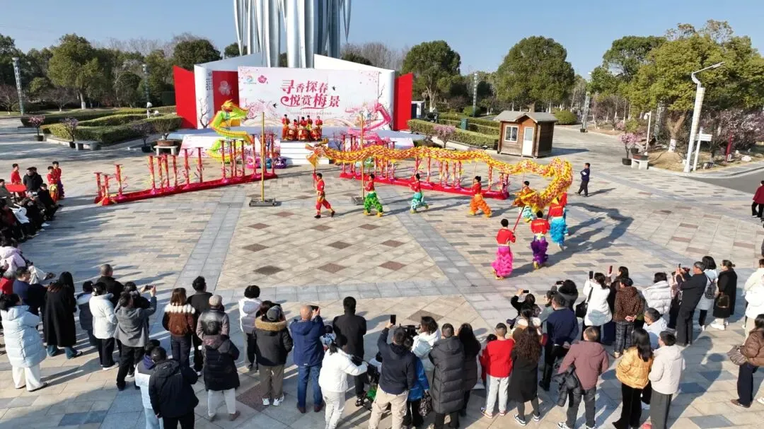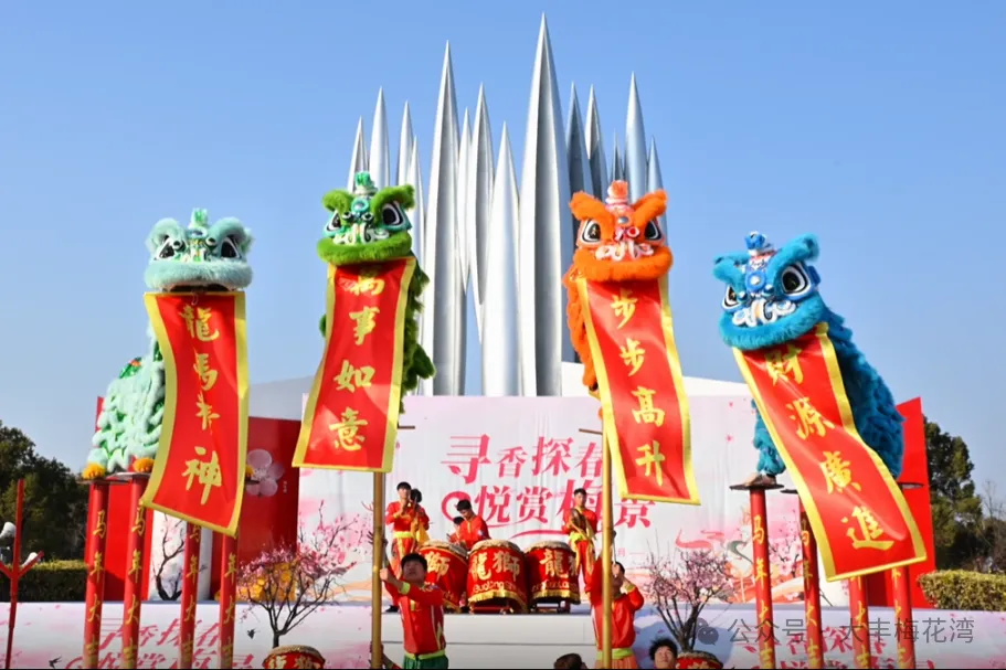 景区醒狮贺岁表演热闹登场,锣鼓声中醒狮腾跃翻转、祈福纳祥,将新春喜庆氛围推向高潮,让游客在赏梅观景的同时,感受传统民俗的独特魅力。
