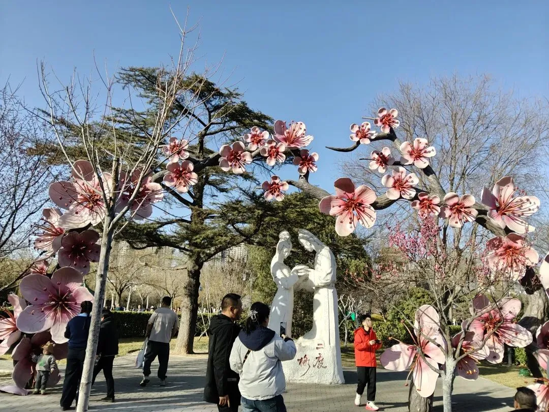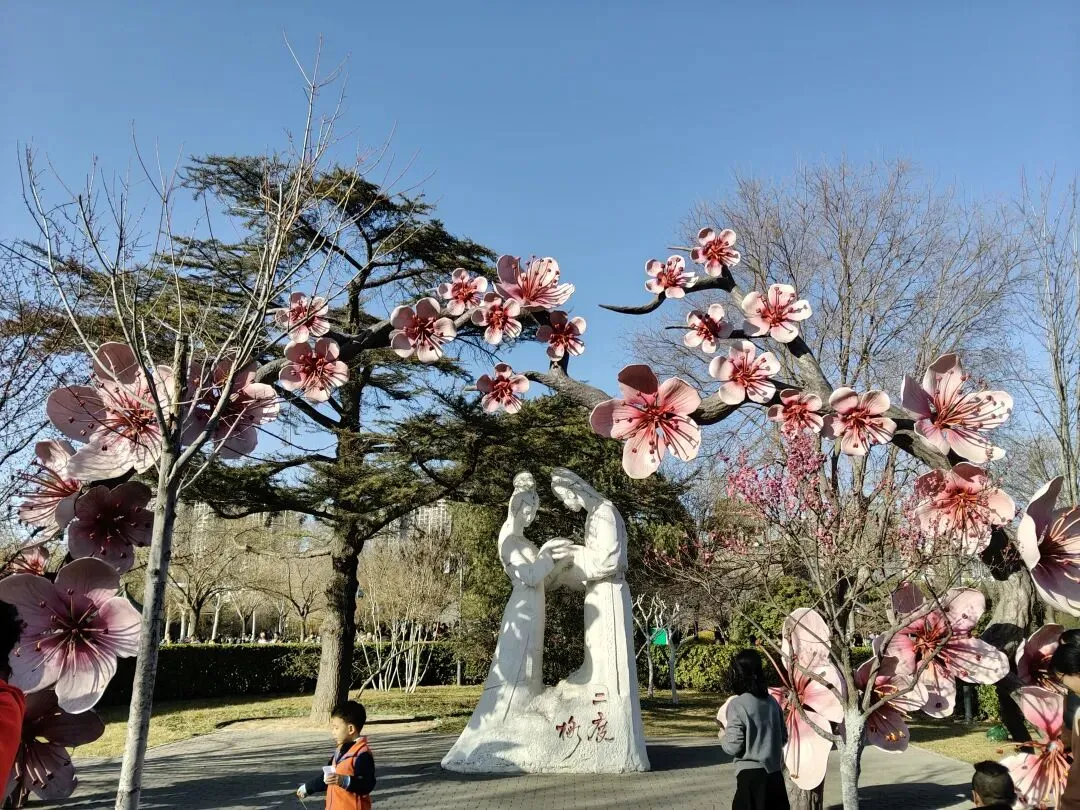 沿西北方向到公园中心,便可看到著名的二度梅雕塑,传说这里是成语“梅开二度”中男女主分别之处。“二度梅”出自清代惜阴堂主人所编小说《二度梅》,讲述了唐朝梅良玉与陈杏元在逆境中历经波折最终团圆的故事。唐朝肃宗年间,奸相卢杞专权,朝臣梅魁因秉公直言遭其诬告谋反,被满门抄斩,儿子梅良玉逃难。吏部尚书陈日升受牵连被削职回乡,来年梅花盛开时,他命家人祭奠梅魁,狂风却吹落梅花。梅良玉流落陈府为书童,夜晚祭父,哭诉若父冤昭雪愿梅花二度开,诚心感动天地,梅花果真二度怒放。陈日升知其身份后,将女儿陈杏元许配给他。