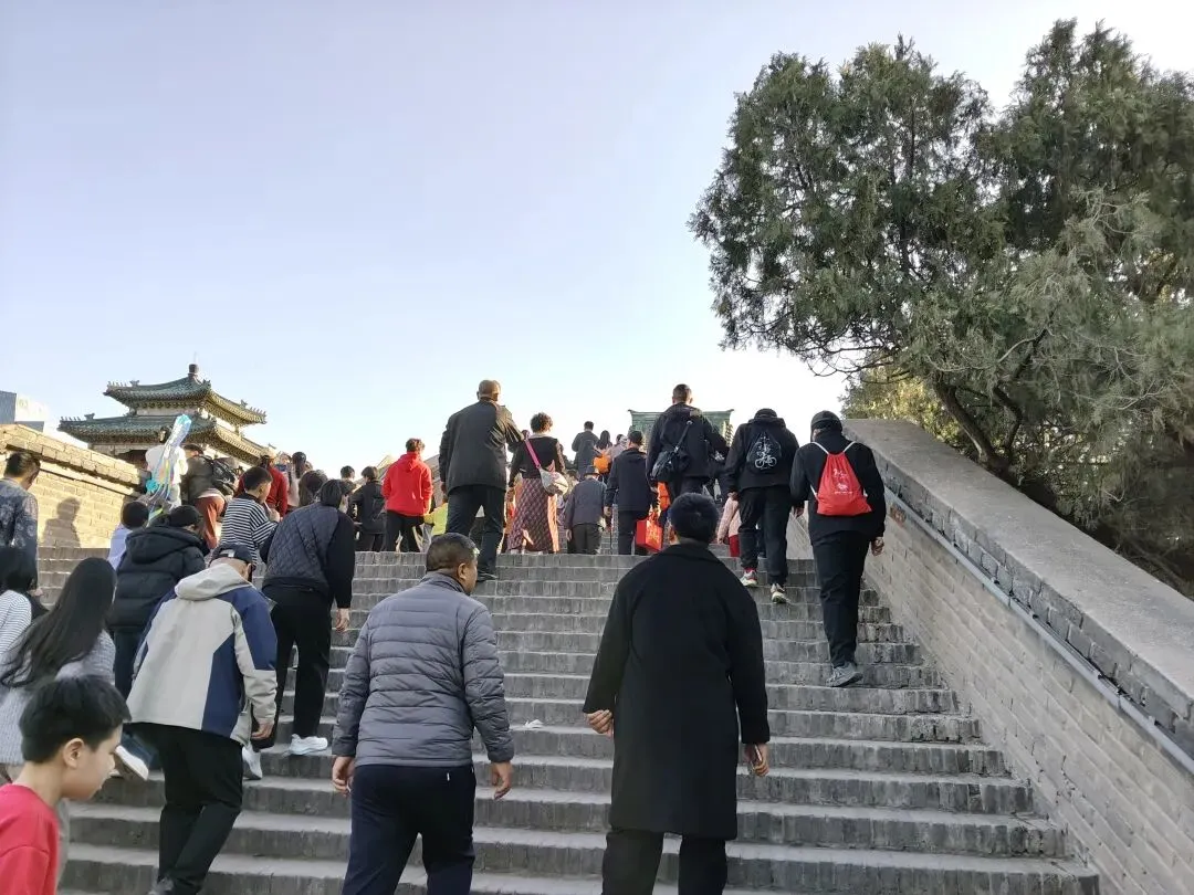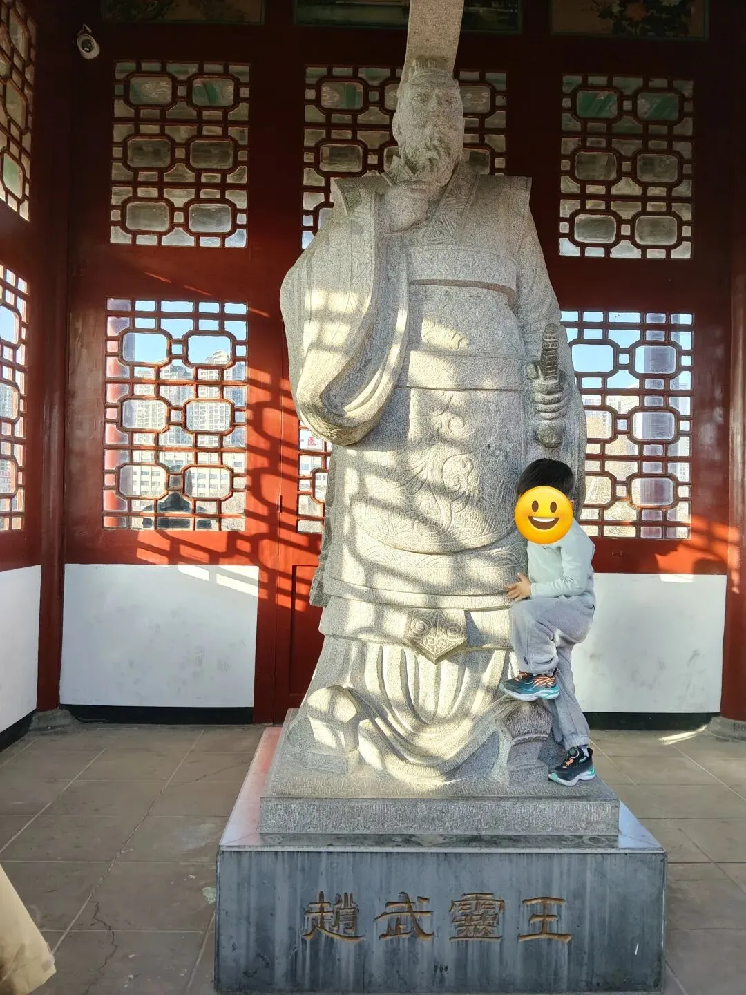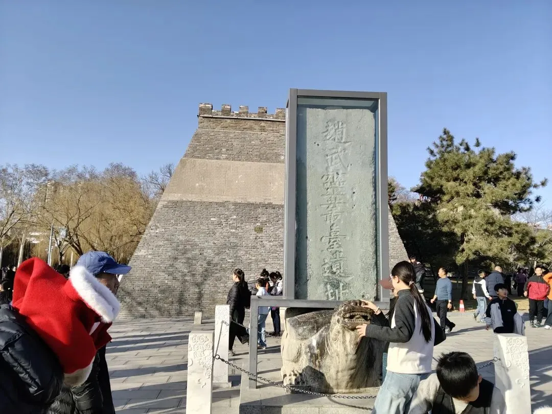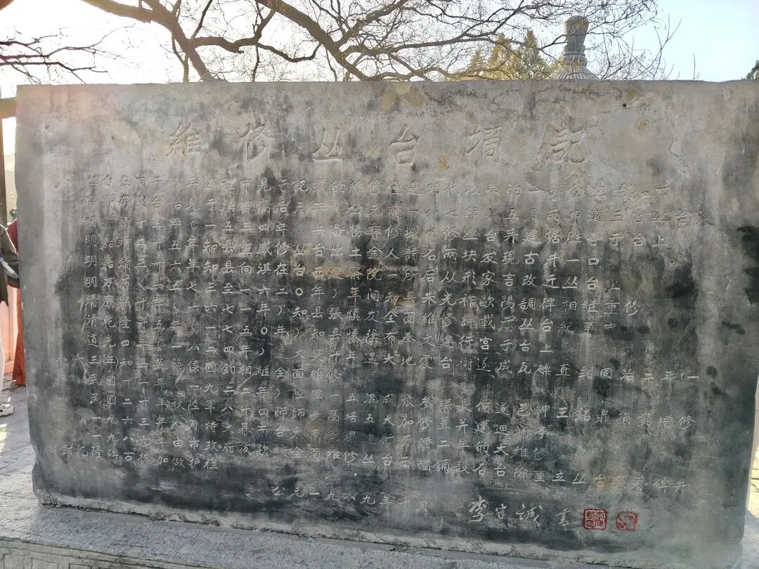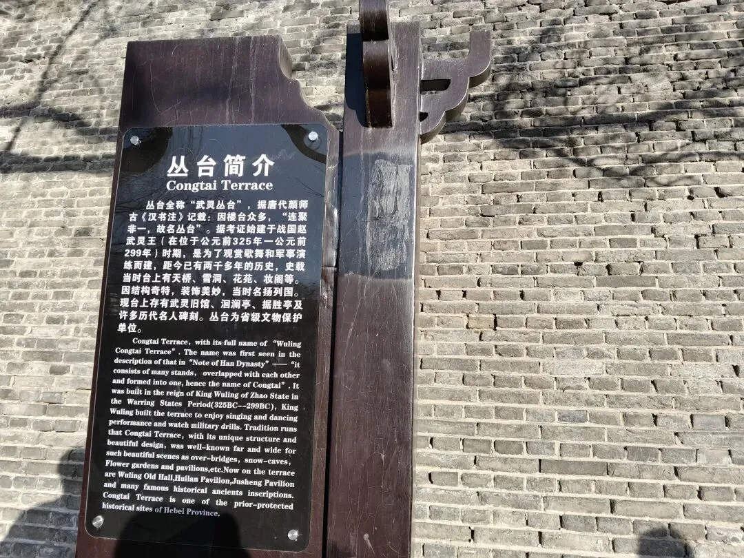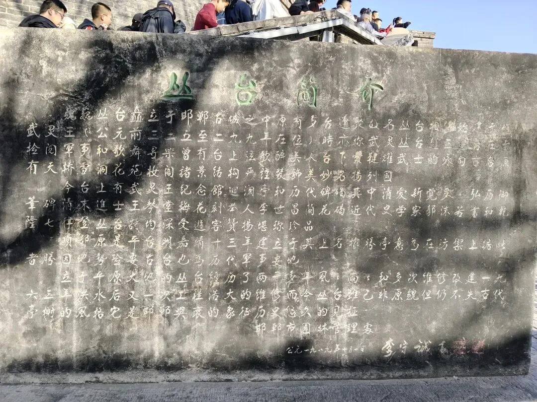 向北即到赵武灵丛台遗址,前有明万历二十一年(1593 年)立碑,由当时的邯郸知县邓云台、主簿王所重等人共同勒石,石碑下有赑屃[bì xì](传说中龙生九子之一,形似龟,好负重)驮碑。建筑历代经历多次毁建,现存建筑为清代同治年间重建。