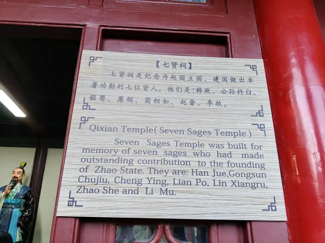 旧三忠祠于明万历十九年(1591 年)由邯郸县令卢龙云建于丛台下,祀公孙杵臼、程婴、韩厥,因其救赵氏孤儿有恩于赵。旧四贤祠亦为郑方坤雍正年间所建。原邑有三贤祠,祀蔺相如、廉颇、李牧。郑方坤以赵奢功绩与三贤相当且同传于《史记》为由,增祀赵奢,改名“四贤祠”。1922年重修丛台时重新合建为七贤祠。