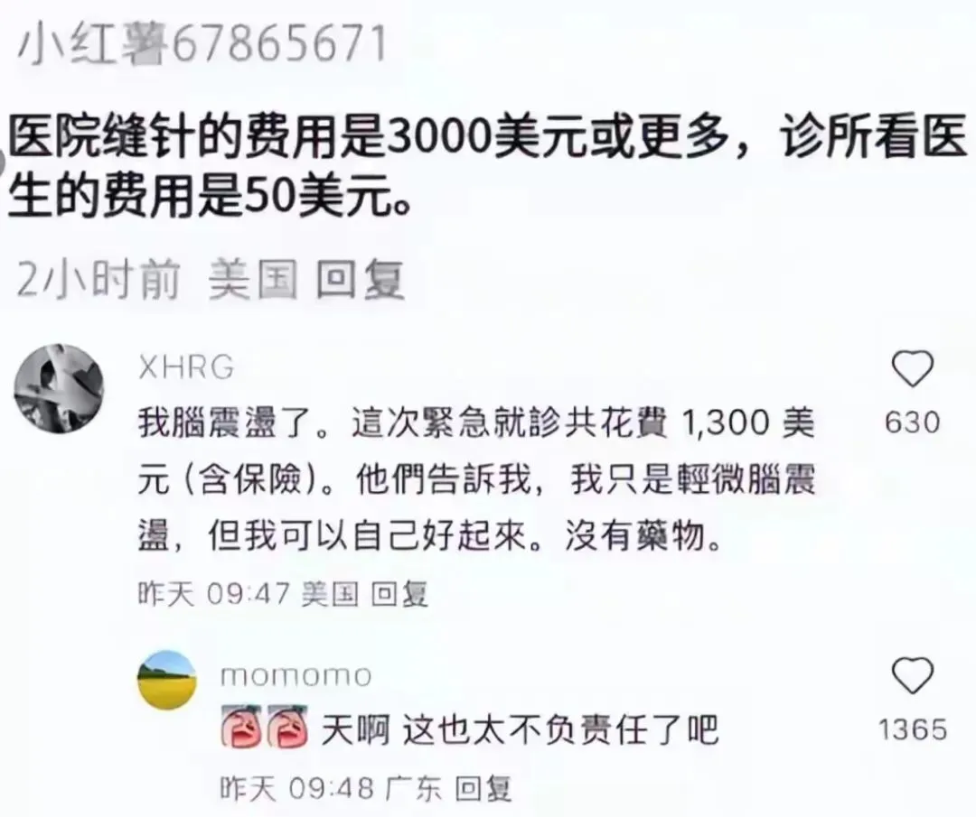 有美国网友发文称,在美国做胃镜花了1万美元,医院缝针动辄1000-3000美元,而中国只用200-500元,相当于几十美元。