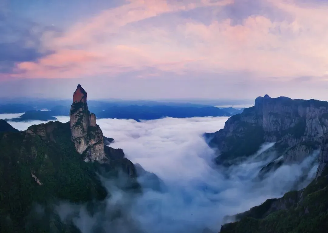 山下是江南峡谷的柔情风光,林泉相依,岩奇、瀑雄、谷幽、洞密、水清、雾美交织成一曲清新的山水协奏;山上则千峰林立,气象恢宏。乘坐缆车缓缓而上,百米高的栈道凌空蜿蜒,鸟鸣在山谷间回旋,云雾在脚下翻涌,移步换景,如行走在云端画廊。