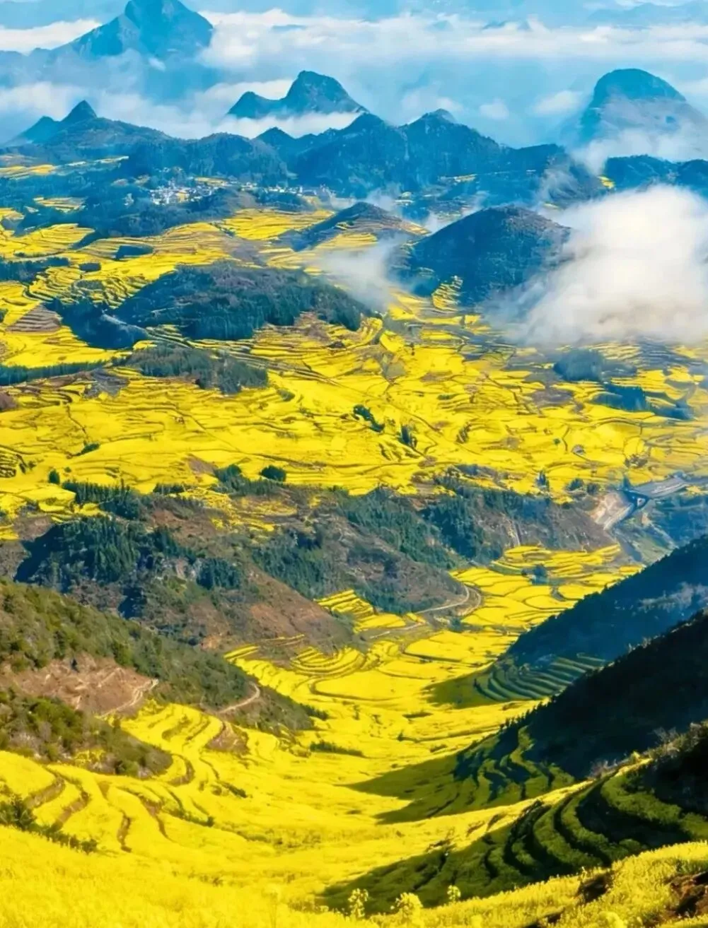 “金鸡报晓”那张航拍图你一定见过,就是这里。油菜花铺满山谷,河流蜿蜒穿过花海——像一幅不真实的画。