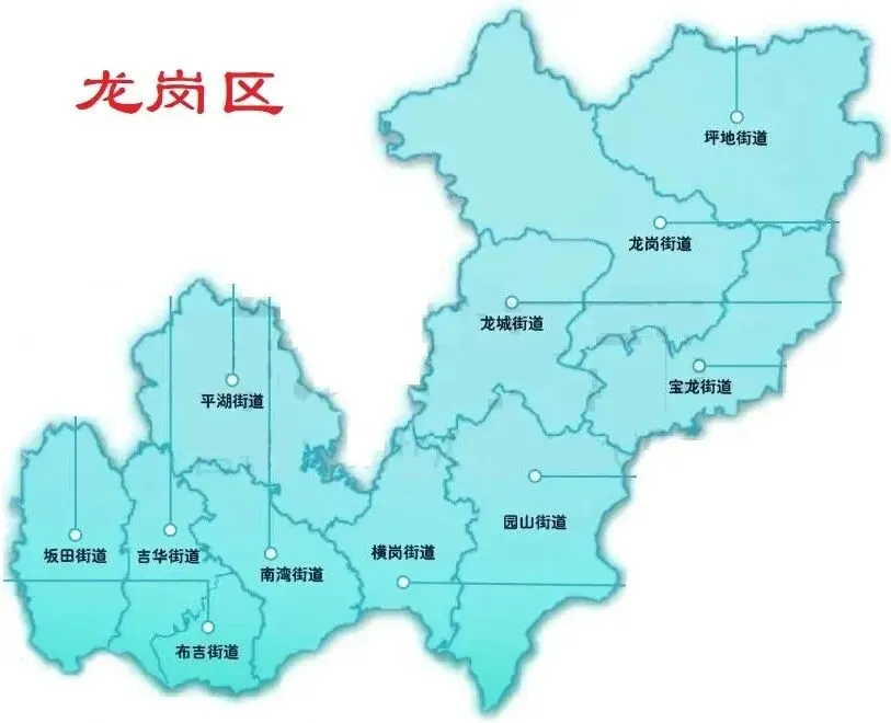 龙岗区下辖14个街道:平湖街道、坪地街道、葵涌街道、大鹏街道、南澳街道、南湾街道、坂田街道、布吉街道、龙城街道、龙岗街道、横岗街道、吉华街道、宝龙街道、园山街道,区政府驻龙翔大道。