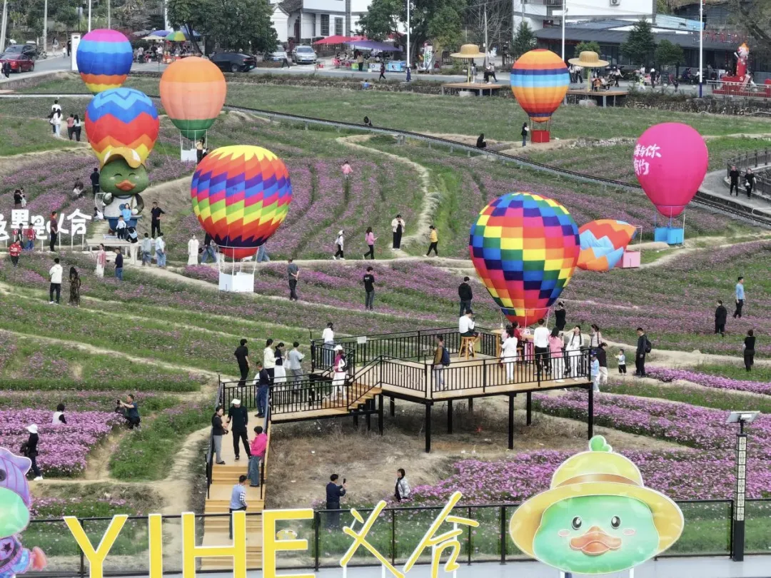 以花为媒、以旅兴业,东源县充分激活乡村生态资源,打造沉浸式田园消费新场景。义合镇下屯村整合阮啸仙故居红色资源与60亩格桑花海,配套观光小火车、热气球、骑马体验等游乐项目,推出“义合鸭IP”文创产品,让游客在田园野趣中邂逅乡村美好。截至2月23日,累计接待游客5.82万人次,单日最高达9100人次,带动村民和村集体增收约50万元。