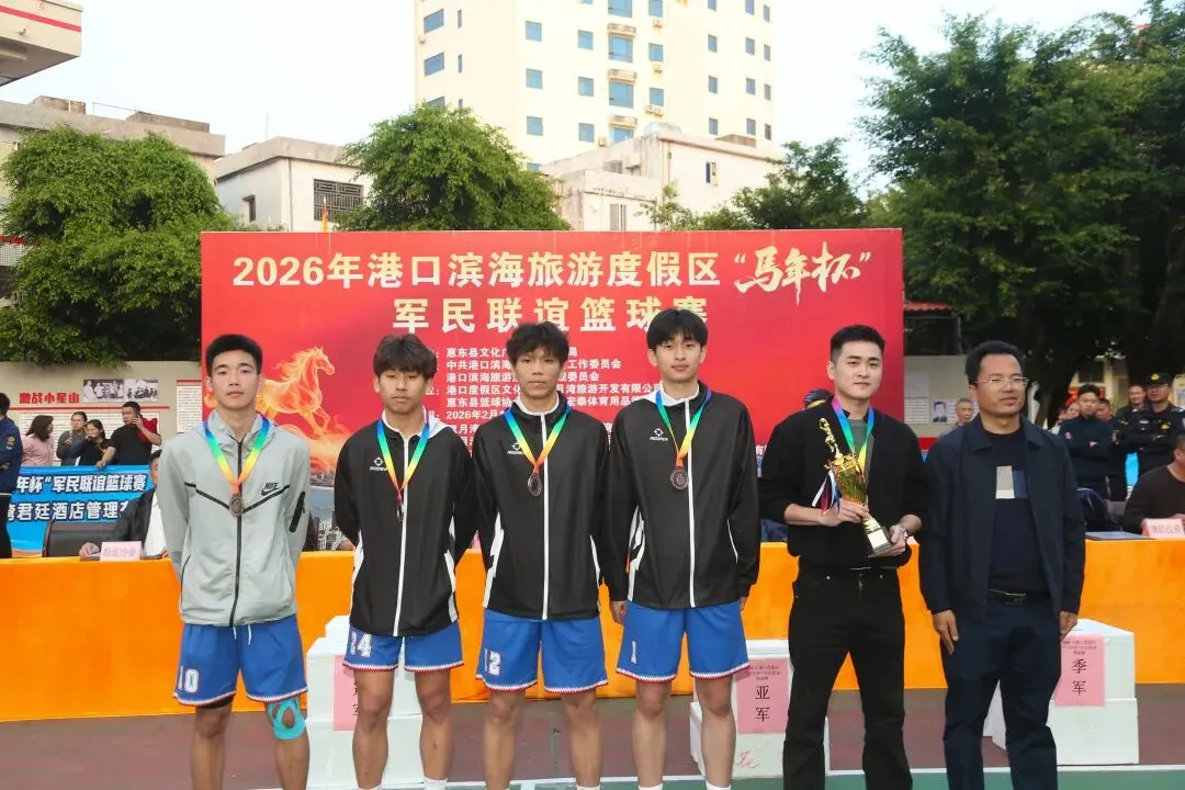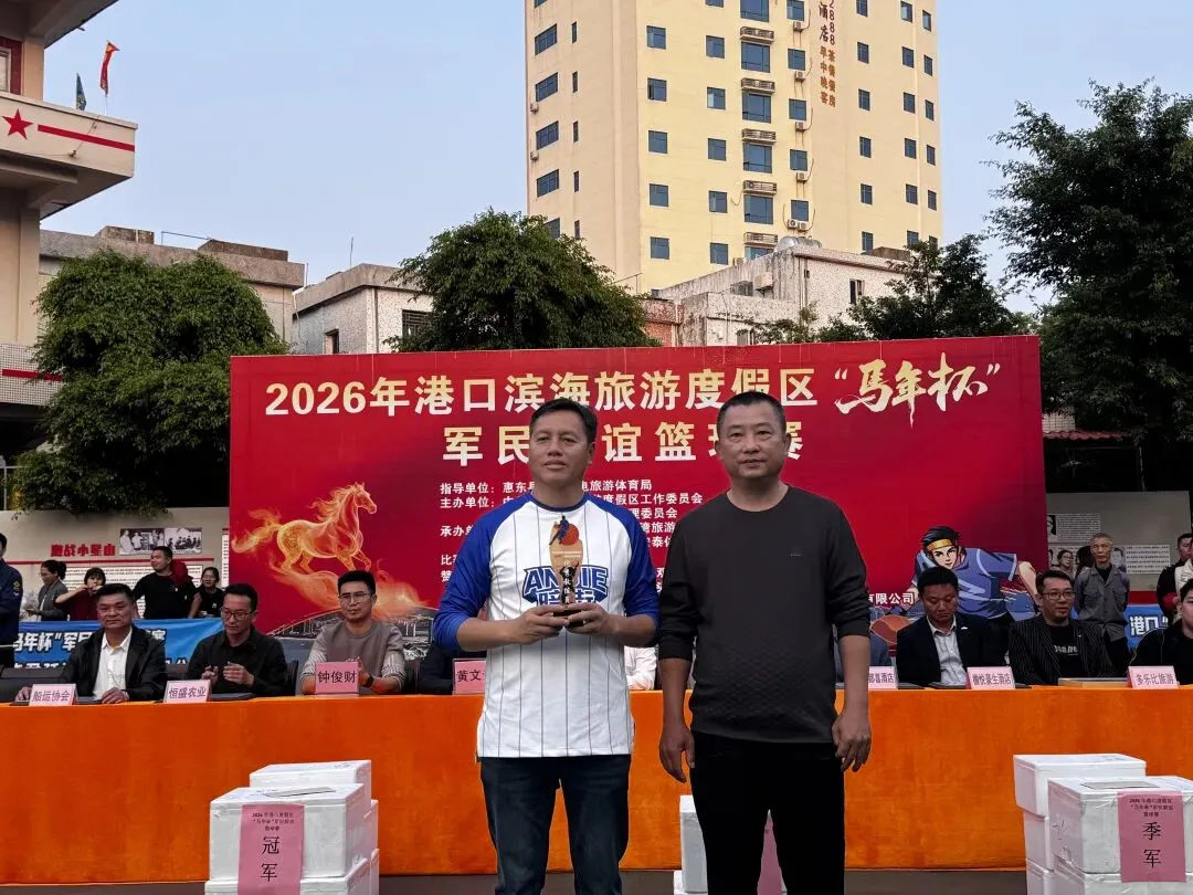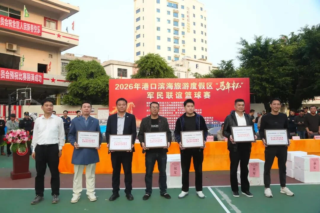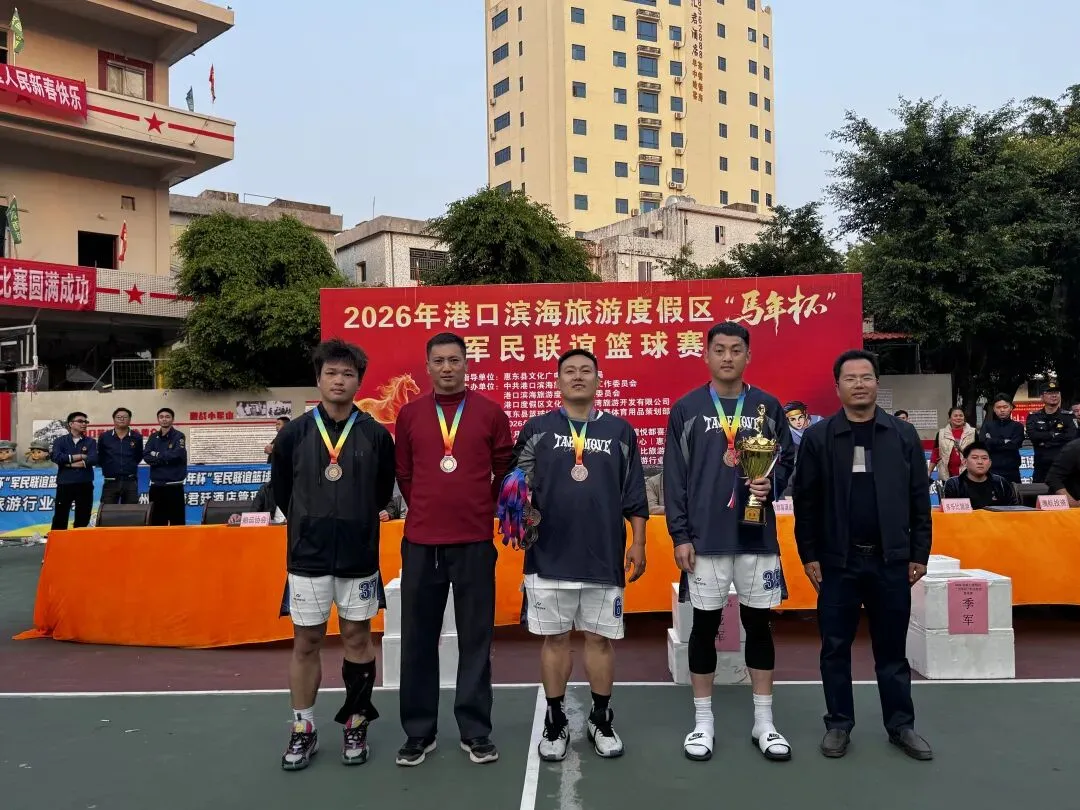由中共港口滨海旅游度假区工作委员会,港口滨海旅游度假区管理委员会主办,惠东县篮球协会承办的2026年港口滨海旅游度假区马年杯军民联谊篮球赛,经过7天共23场的激烈角逐,于2月21日大年初五在港口英雄民兵连红军小学圆满闭幕! 出席闭幕式的领导与嘉宾 赛场上激情迸发