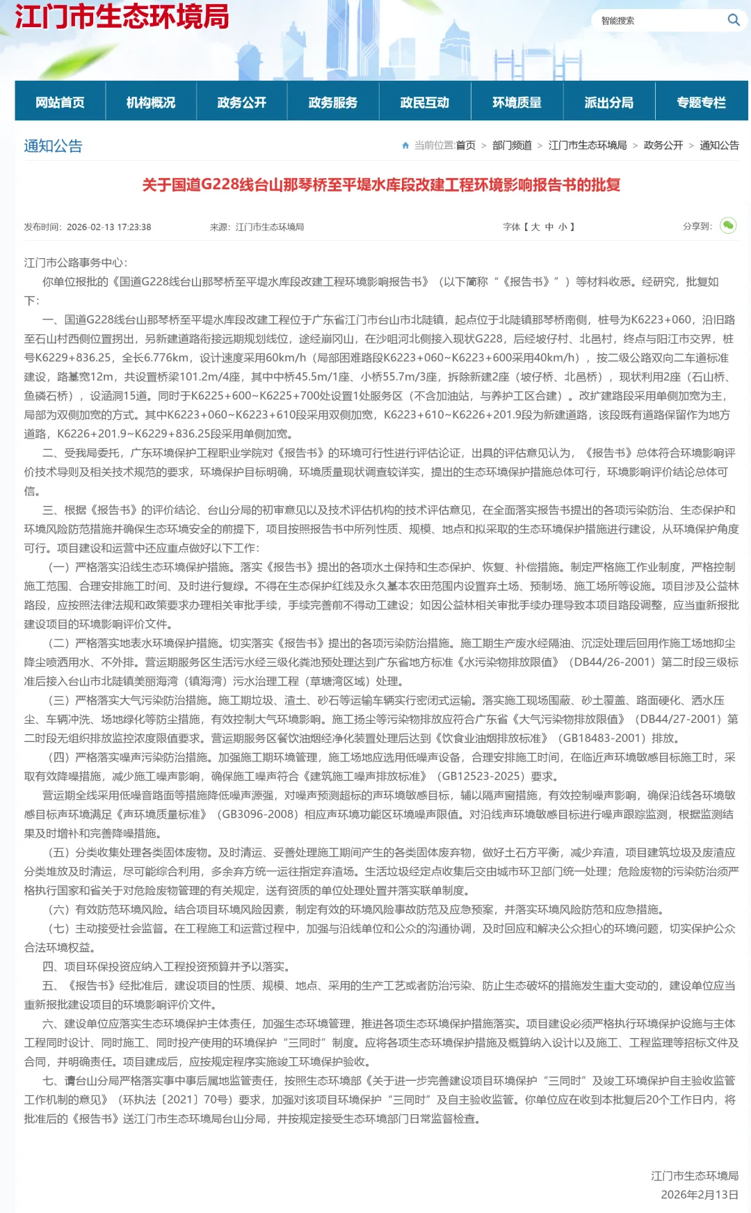 广东滨海旅游公路粤西向这段改建工程获批,路线全长约8.5公里2026年2月13日,关于国道G228线台山那琴桥至平堤水库段改建工程环境影响报告书的批复,据了解此段也属于广东滨海旅游公路段。 国道G228线台山那琴桥至平堤水库段改建工程位于广东省江门市台山市北陡镇,起点位于北陡镇那琴桥南侧,桩号为K6223+060,沿旧路至石山村西侧位置拐出,另新建道路衔接远期规划线位,途经崩冈山,在沙咀河北侧接入现状G228,后经坡仔村、北邑村,终点与阳江市交界,桩号K6229+836.25,全长6.776km,设计速度采用60km/h(局部困难路段K6223+060~K6223+600采用40km/h),按二级公路双向二车道标准建设,路基宽12m,共设置桥梁101.2m/4座,其中中桥45.5m/1座、小桥55.7m/3座,拆除新建2座(坡仔桥、北邑桥),现状利用2座(石山桥、鱼磷石桥),设涵洞15道。同时于K6225+600~K6225+700处设置1处服务区(不含加油站,与养护工区合建)。改扩建路段采用单侧加宽为主,局部为双侧加宽的方式。其中K6223+060~K6223+610段采用双侧加宽,K6223+610~K6226+201.9段为新建道路,该段既有道路保留作为地方道路,K6226+201.9~K6229+836.25段采用单侧加宽。